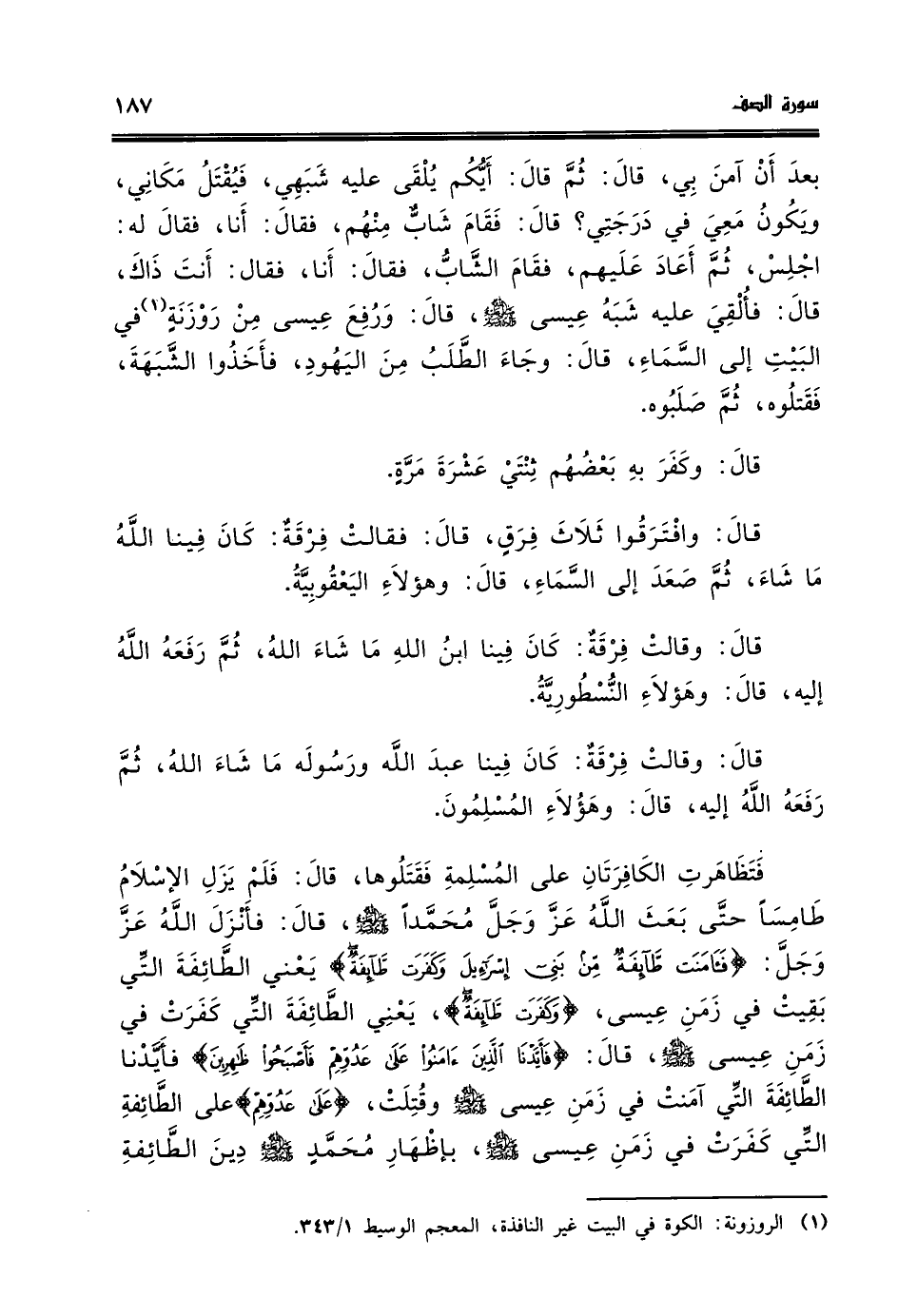فتظاهرت الكافرتان على المسلمة فقتلوها قال فلم يزل الاسلام طامسا حتى بعث الله عز وجل محمدا صلي الله عليه وسلم قال فانزل الله عز وجل فئامنت طائفة من بنى اسرائيل وكفرت طائفة يعني الطائفة التي بقيت في زمن عيسي وكفرت طائفة يعني الطائفة التي كفرت في زمن عيسي عليه السلام قال فاتدنا الذين ءامنوا على عدوهم فاصبحوا ظاهرين فايدنا الطائفة التي امنت في زمن عيسى عليه السلام وقتلت على عدوهم على الطائفة التي كفرت في زمن عيسى عليه السلام بباظهار محمد صلي الله عليه وسلم دين الطائفة