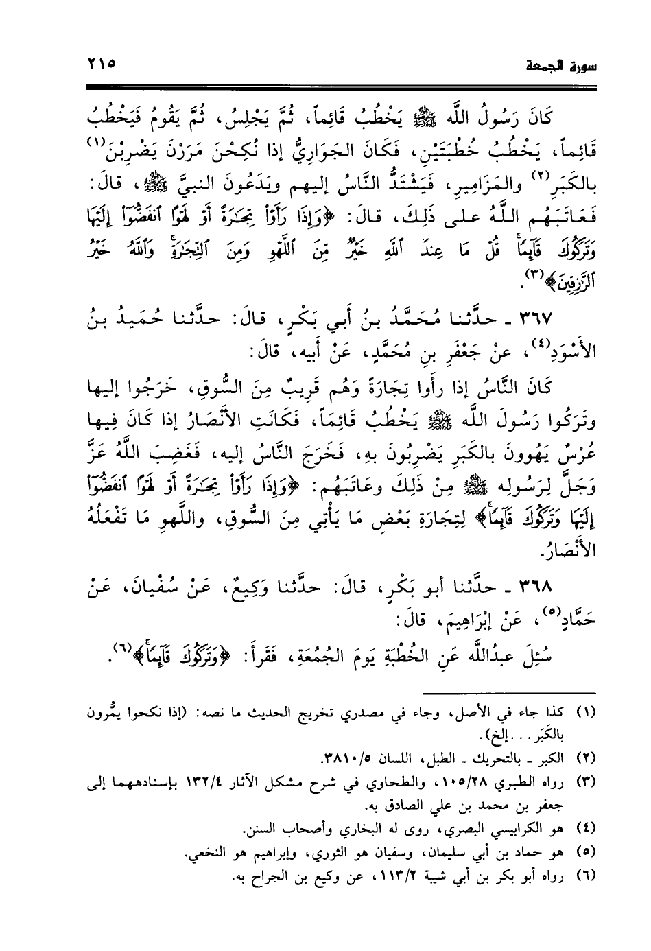 كان رسول الله صلي الله عليه وسلم يخطب قائما ثم يجلس ثم يقوم فيخطب قائما يخطب خطبتين فكان الجواري اذا نكحن مرن يضربن بالكبر ومالمزامير فيشتد الناس اليهم ويدعون النبي صلي الله عليه وسلم قال فعاتبهم الله على ذلك قال: وَإِذَا رَأَوْا تِجَارَةً أَوْ لَهْوًا انْفَضُّوا إِلَيْهَا وَتَرَكُوكَ قَائِمًا قُلْ مَا عِنْدَ اللَّهِ خَيْرٌ مِنَ اللَّهْوِ وَمِنَ التِّجَارَةِ وَاللَّهُ خَيْرُ الرَّازِقِينَ