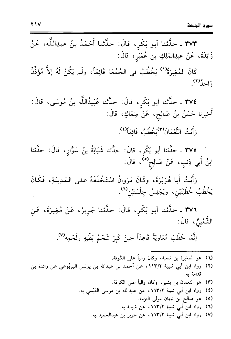374 - حدثنا ابو بكر قال حدثنا عبيد الله بن موسي قال اخبرنا حسن بن صالح عن سماك قال رايت النعمان يخطب قائما