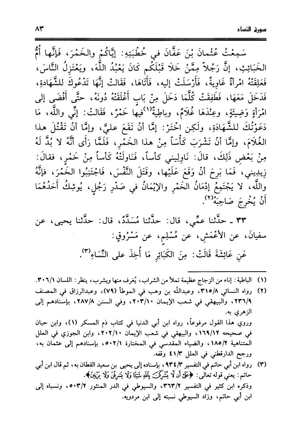 33 - حدثنا عمي قال حدثنا مسدود قال حدثنا يحيى عن سفيان عن الاعمش عن مسلم عن مسروق