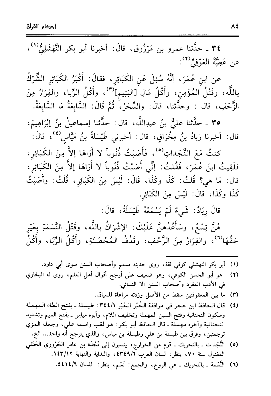 35 - حدثنا علي بن عبد الله قال حدثنا اسماعيل بن ابراهيم قال اخبرنا زياد بن مخراق قال اخبرنا زياد بن مخراق قال اخبرني طيسلة بن مياس قال كنت مع النجدات فاصبت ذنوبا لا اراها الا من الكبائر فلقيت ابن عمر فلقيت ابن عمر فقلت ابن عمر فقلت اني اصبت ذنوبا لا اراها الا من الكبائر قال ماهي قلت كذا وكذا قال ليس من الكبائر قلت واصبت كذا وكذا قال ليس من الكبائر