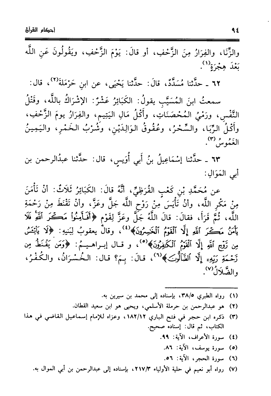 عن محمد بن كعب القرظي انه قال الكبائر ثلاث ان تامن من مكر الله وان تياس من روح الله جل وعز وان تقنط من رحمة الله ثم قرا فقال قال الله جل وعز لقوم افامنوا مكر الله فلا يامن مكر الله الا القوم الخاسرون وقال يعقوب لبنيه لا يائس من روح الله الا القوم الكافرون وقال ابراهيم ومن يقنط من رحمة ربه الا الضالون قال بم قال الخسران والكفر والضلال