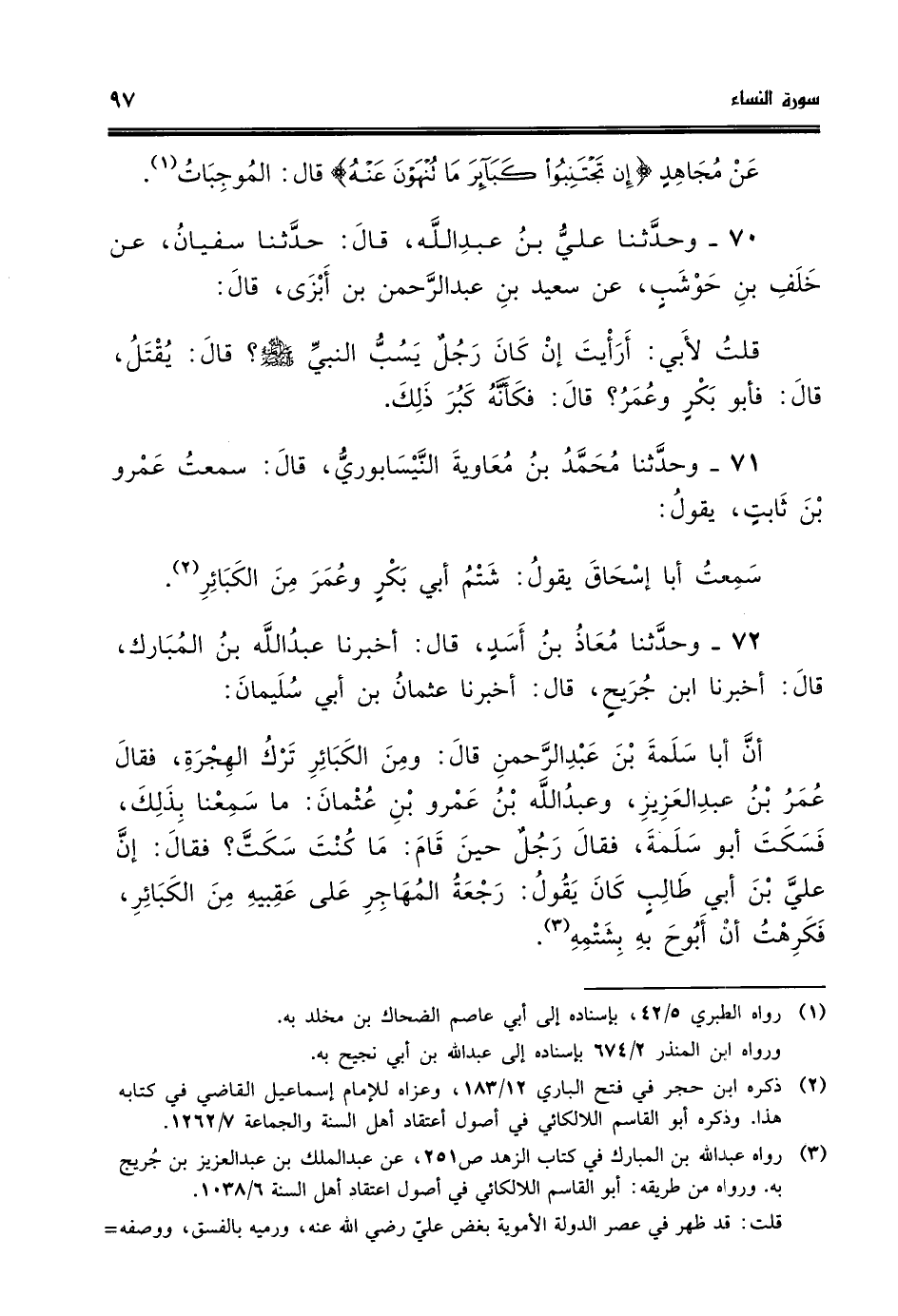 عن مجاهد ان تجتنبوا كبائر ما تنهون عنه قال الموجبات