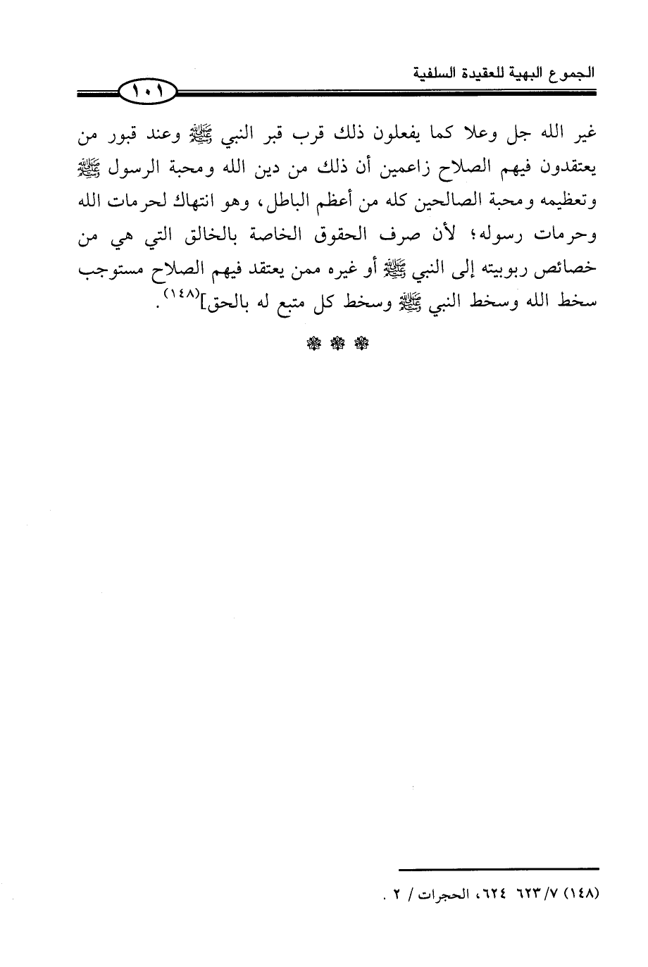 يَفْعَلُونَ ذَلِكَ قُرْبَ قَبْرِ النَّبِيِّ صَلَّى اللَّهُ عَلَيْهِ وَسَلَّمَ وَعِنْدَ قُبُورِ مَنْ يَعْتَقِدُونَ فِيهِمُ الصَّلَاحَ زَاعِمِينَ أَنَّ ذَلِكَ مِنْ دِينِ اللَّهِ وَمَحَبَّةِ الرَّسُولِ صَلَّى اللَّهُ عَلَيْهِ وَسَلَّمَ وَتَعْظِيمِهِ وَمَحَبَّةِ الصَّالِحِينَ كُلُّهُ مِنْ أَعْظَمِ الْبَاطِلِ، وَهُوَ انْتِهَاكٌ لِحُرُمَاتِ اللَّهِ وَحُرُمَاتِ رَسُولِهِ؛ لِأَنَّ صَرْفَ الْحُقُوقِ الْخَاصَّةِ بِالْخَالِقِ الَّتِي هِيَ مِنْ خَصَائِصَ رُبُوبِيَّتِهِ إِلَى النَّبِيِّ صَلَّى اللَّهُ عَلَيْهِ وَسَلَّمَ أَوْ غَيْرِهِ مِمَّنْ يُعْتَقَدُ فِيهِمُ الصَّلَاحُ مُسْتَوْجِبٌ سَخَطَ اللَّهِ وَسَخَطَ النَّبِيِّ صَلَّى اللَّهُ عَلَيْهِ وَسَلَّمَ وَسَخَطَ كل مُتبع لَهُ بِالْحَقِّ] (¬1) .