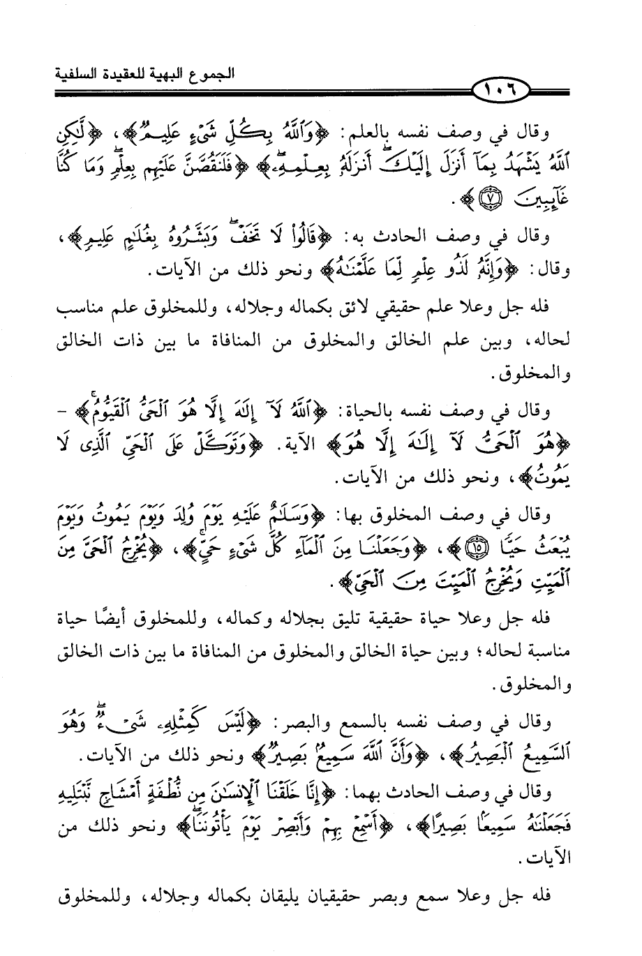 وَقَالَ فِي وَصْفِ نَفْسِهِ بِالسَّمْعِ وَالْبَصَرِ: (لَيْسَ كَمِثْلِهِ شَىْءٌ وَهُوَ السَّمِيعُ الْبَصِيرُ) ، (وَأَنَّ اللَّهَ سَمِيعٌ بَصِيرٌ) وَنَحْوَ ذَلِكَ مِنَ الْآيَاتِ.