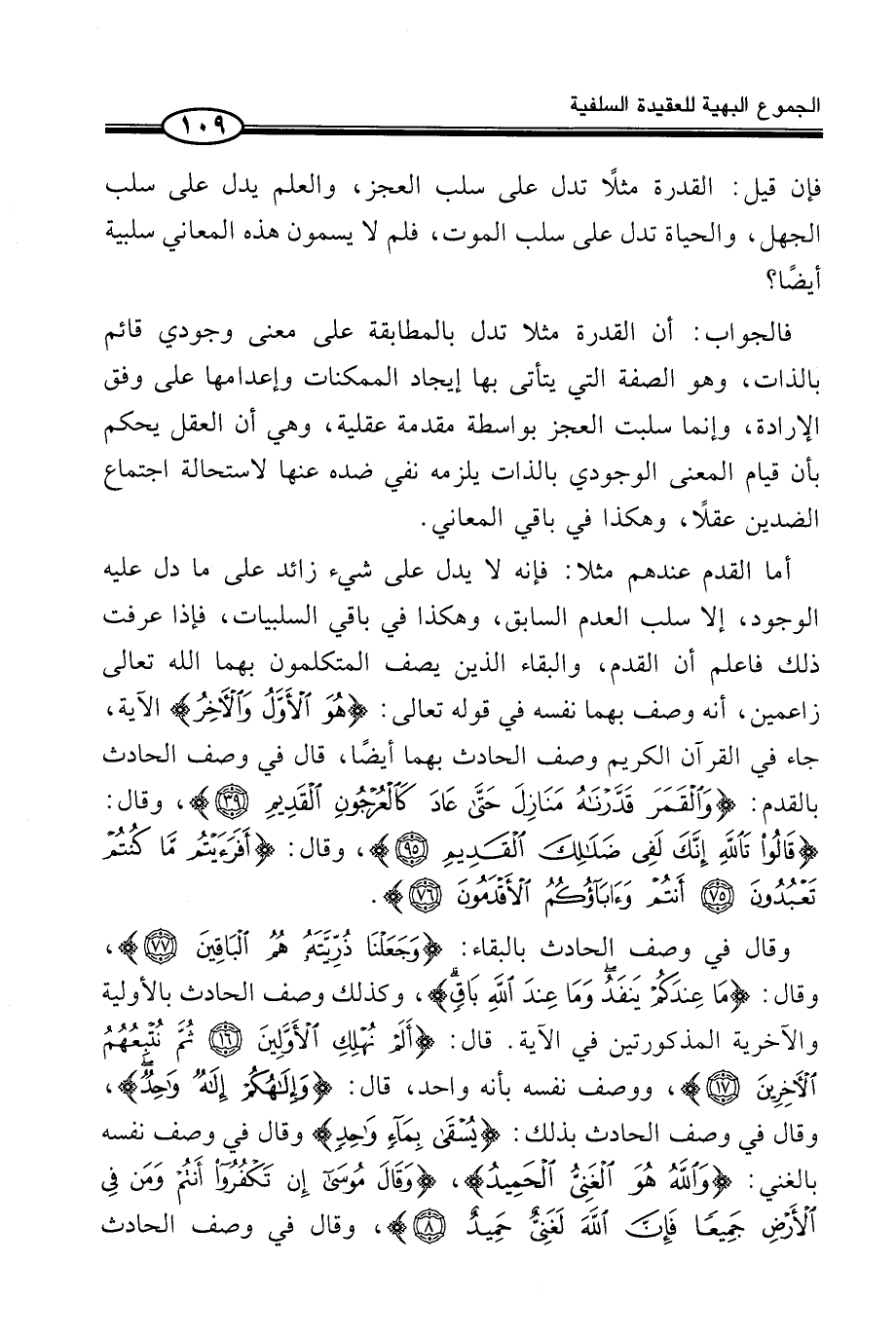 أَمَّا الْقِدَمُ عِنْدَهُمْ مَثَلًا: فَإِنَّهُ لَا يَدُلُّ عَلَى شَيْءٍ زَائِدٍ عَلَى مَا دَلَّ عَلَيْهِ الْوُجُودُ، إِلَّا سَلْبُ الْعَدَمِ السَّابِقِ، وَهَكَذَا فِي بَاقِي السَّلْبِيَّاتِ، فَإِذَا عرفت ذَلِك فَاعْلَم أَن الْقدَم، والبقاء الَّذين يَصِفُ الْمُتَكَلِّمُونَ بِهِمَا اللَّهَ تَعَالَى زَاعِمِينَ، أَنَّهُ وَصَفَ بِهِمَا نَفْسَهُ فِي قَوْلِهِ تَعَالَى: (هُوَ الأَوَّلُ وَالآخِرُ) الْآيَةَ، جَاءَ فِي الْقُرْآنِ الْكَرِيمِ وَصْفُ الْحَادِثِ بِهِمَا أَيْضًا، قَالَ فِي وَصْفِ الْحَادِثِ بِالْقِدَمِ: (وَالْقَمَرَ قَدَّرْنَاهُ مَنَازِلَ حَتَّى عَادَ كَالعُرجُونِ الْقَدِيمِ) ، وَقَالَ: (قَالُواْ تَاللَّهِ إِنَّكَ لَفِى ضَلَالِكَ الْقَدِيمِ) ، وَقَالَ: (أَفَرَءَيْتُمْ مَّا كُنْتُمْ تَعْبُدُونَ أَنتُمْ وَآبَآؤُكُمُ الأَقْدَمُونَ) .