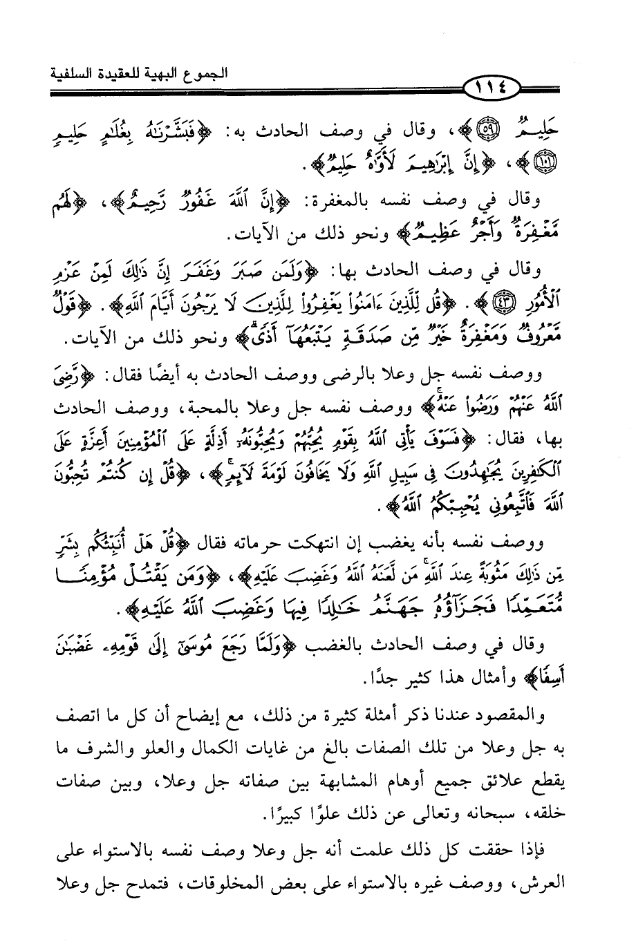 وَوَصَفَ نَفْسَهُ جَلَّ وَعَلَا بِالرِّضَى وَوَصَفَ الْحَادِثَ بِهِ أَيْضًا فَقَالَ: (رَّضِىَ اللَّهُ عَنْهُمْ وَرَضُواْ عَنْهُ) وَوَصَفَ نَفْسَهُ جَلَّ وَعَلَا بِالْمَحَبَّةِ، وَوَصَفَ الْحَادِثَ بِهَا، فَقَالَ: (فَسَوْفَ يَأْتِى اللَّهُ بِقَوْمٍ يُحِبُّهُمْ وَيُحِبُّونَهُ أَذِلَّةٍ عَلَى الْمُؤْمِنِينَ أَعِزَّةٍ عَلَى الْكَافِرِينَ يُجَاهِدُونَ فِى سَبِيلِ اللَّهِ وَلاَ يَخَافُونَ لَوْمَةَ لَا?ئِمٍ) ، (قُلْ إِن كُنتُمْ تُحِبُّونَ اللَّهَ فَاتَّبِعُونِى يُحْبِبْكُمُ اللَّهُ) .