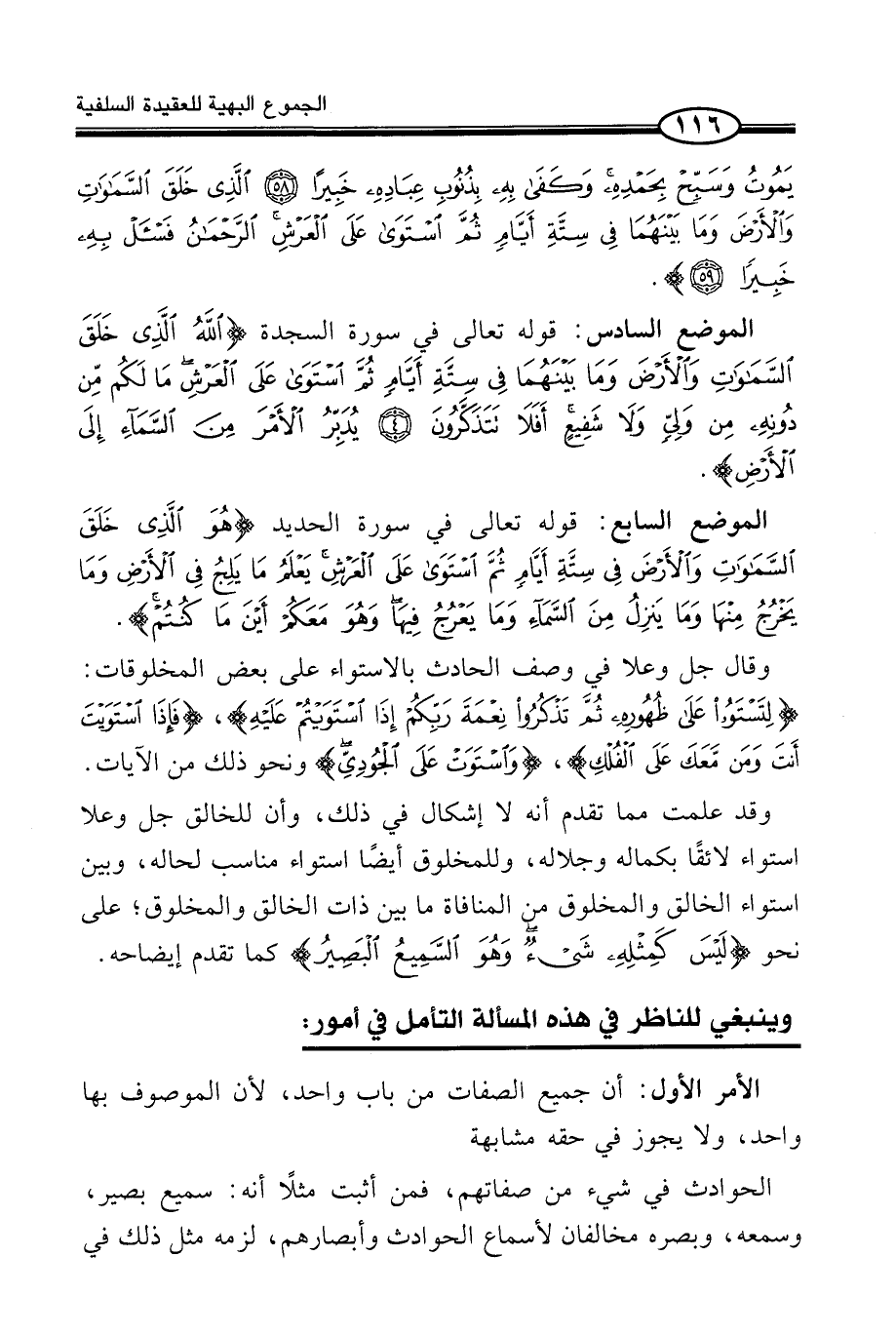 الْمَوْضِعُ السَّادِسُ: قَوْلُهُ تَعَالَى فِي سُورَةِ السَّجْدَةِ (اللَّهُ الَّذِى خَلَقَ السَّمَاوَاتِ وَالأَرْضَ وَمَا بَيْنَهُمَا فِى سِتَّةِ أَيَّامٍ ثُمَّ اسْتَوَى عَلَى الْعَرْشِ مَا لَكُمْ مِّن دُونِهِ مِن وَلِيٍّ وَلاَ شَفِيعٍ أَفَلاَ تَتَذَكَّرُونَ يُدَبِّرُ الأَمْرَ مِنَ السَّمَآءِ إِلَى الأَرْضِ) .
