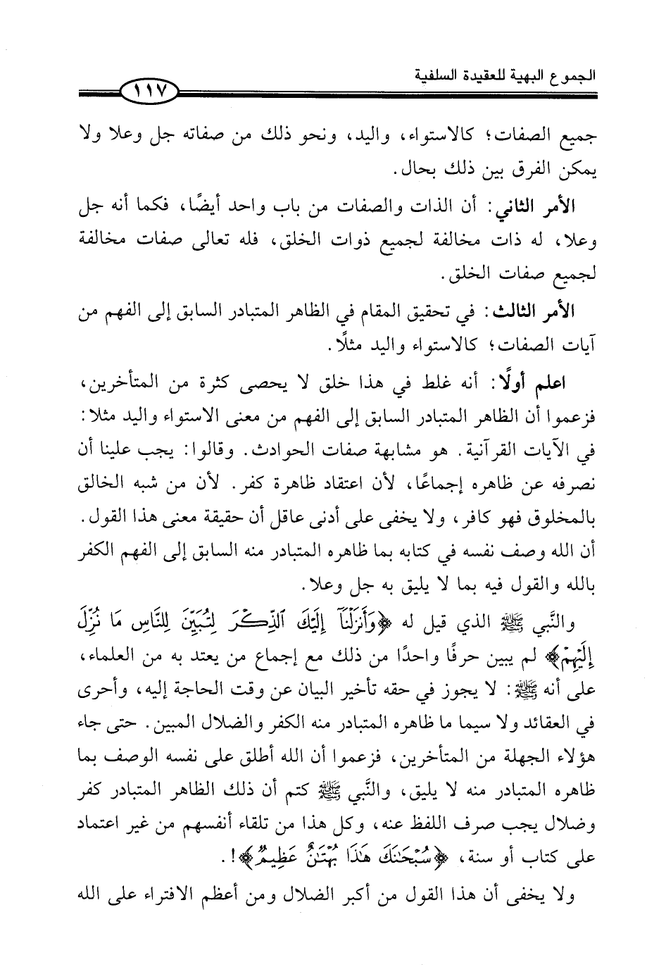 والنَّبي صَلَّى اللَّهُ عَلَيْهِ وَسَلَّمَ الَّذِي قِيلَ لَهُ (وَأَنزَلْنَا إِلَيْكَ الذِّكْرَ لِتُبَيِّنَ لِلنَّاسِ مَا نُزِّلَ إِلَيْهِمْ) لَمْ يُبَيِّنْ حَرْفًا وَاحِدًا مِنْ ذَلِكَ مَعَ إِجْمَاعِ مَنْ يَعْتَدُّ بِهِ مِنَ الْعُلَمَاءِ، عَلَى أَنَّهُ صَلَّى اللَّهُ عَلَيْهِ وَسَلَّمَ: لَا يَجُوزُ فِي حَقِّهِ تَأْخِيرُ الْبَيَانِ عَنْ وَقْتِ الْحَاجَةِ إِلَيْهِ، وَأَحْرَى فِي الْعَقَائِدِ وَلَا سِيَّمَا مَا ظَاهِرُهُ الْمُتَبَادِرُ مِنْهُ الْكُفْرُ وَالضَّلَالُ الْمُبِينُ. حَتَّى جَاءَ هَؤُلَاءِ الْجَهَلَةُ مِنَ الْمُتَأَخِّرِينَ، فَزَعَمُوا أَنَّ اللَّهَ أَطْلَقَ عَلَى نَفْسِهِ الْوَصْفَ بِمَا ظَاهِرُهُ الْمُتَبَادِرُ مِنْهُ لَا يَلِيقُ، والنَّبي صَلَّى اللَّهُ عَلَيْهِ وَسَلَّمَ كَتَمَ أَنَّ ذَلِكَ الظَّاهِرَ الْمُتَبَادِرَ كُفْرٌ وَضَلَالٌ يَجِبُ صَرْفُ اللَّفْظِ عَنْهُ، وَكُلُّ هَذَا مِنْ تِلْقَاءِ أَنْفُسِهِمْ مِنْ غَيْرِ اعْتِمَادٍ عَلَى كِتَابٍ أَوْ سنة، (سُبْحَانَكَ هَاذَا بُهْتَانٌ عَظِيمٌ) !