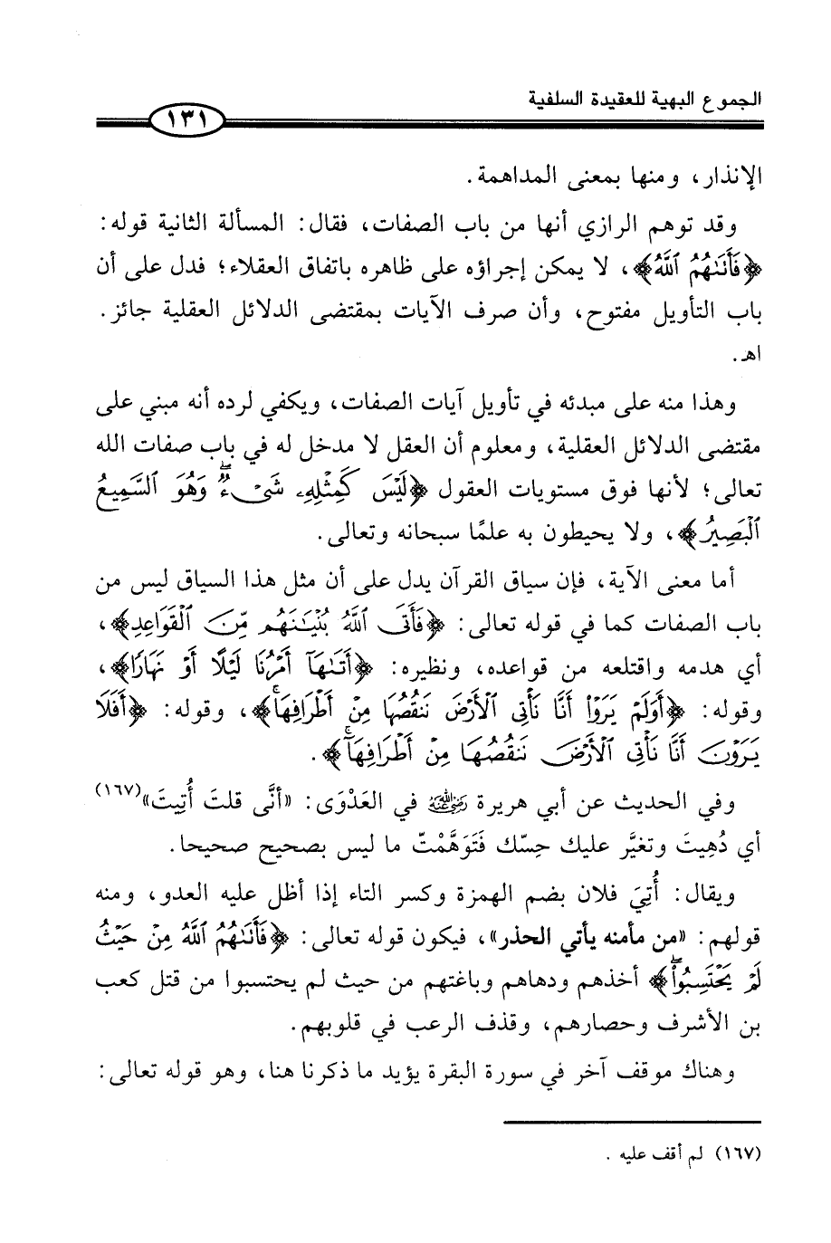 وَقَدْ تَوَهَّمَ الرَّازِيُّ أَنَّهَا مِنْ بَابِ الصِّفَاتِ، فَقَالَ: الْمَسْأَلَةُ الثَّانِيَةُ قَوْلُهُ: (فَأَتَاهُمُ اللَّهُ) ، لَا يُمْكِنُ إِجْرَاؤُهُ عَلَى ظَاهره بِاتِّفَاق الْعُقَلَاءِ؛ فَدَلَّ عَلَى أَنَّ بَابَ التَّأْوِيلِ مَفْتُوحٌ، وَأَن صرف الْآيَات بِمُقْتَضى الدَّلَائِل الْعَقْلِيَّة جَائِز. اهـ.