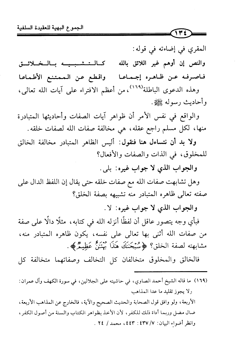 وَهَلْ تَشَابَهَتْ صِفَاتُ اللَّهِ مَعَ صِفَاتِ خَلْقِهِ حَتَّى يُقَالَ إِنَّ اللَّفْظَ الدَّالَّ عَلَى صِفَتِهِ تَعَالَى ظَاهِرُهُ الْمُتَبَادِرُ مِنْهُ تَشْبِيهُهُ بِصِفَةِ الْخَلْقِ؟