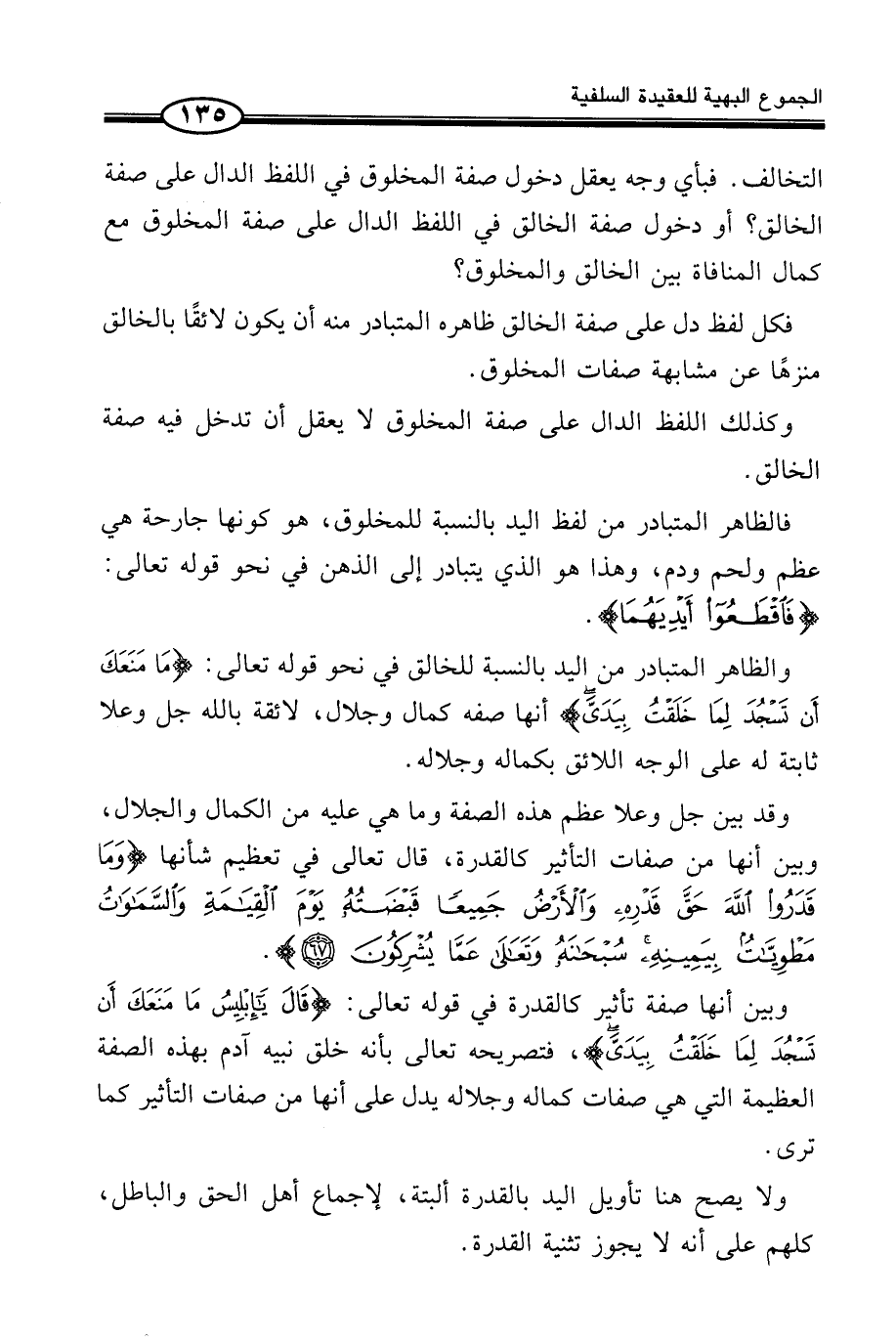 فَكُلُّ لَفْظٍ دَلَّ عَلَى صِفَةِ الْخَالِقِ ظَاهِرُهُ الْمُتَبَادِرُ مِنْهُ أَنْ يَكُونَ لَائِقًا بِالْخَالِقِ مُنَزَّهًا عَنْ مُشَابَهَةِ صِفَاتِ الْمَخْلُوقِ.