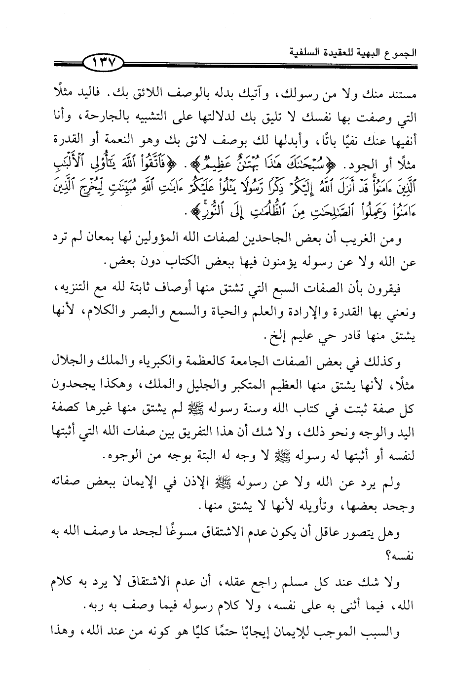 وَكَذَلِكَ فِي بَعْضِ الصِّفَاتِ الْجَامِعَةِ كَالْعَظَمَةِ وَالْكِبْرِيَاءِ وَالْمُلْكِ وَالْجَلَالِ مَثَلًا، لِأَنَّهَا يُشْتَقُّ مِنْهَا الْعَظِيمُ الْمُتَكَبِّرُ وَالْجَلِيلُ وَالْمَلِكُ، وَهَكَذَا يَجْحَدُونَ كُلَّ صِفَةٍ ثَبَتَتْ فِي كِتَابُ اللَّهِ وَسُنَّةُ رَسُولِهِ صَلَّى اللَّهُ عَلَيْهِ وَسَلَّمَ لَمْ يُشْتَقَّ مِنْهَا غَيْرُهَا كَصِفَةِ الْيَدِ وَالْوَجْهِ وَنَحْوِ ذَلِكَ، وَلَا شَكَّ أَنَّ هَذَا التَّفْرِيقَ بَيْنَ صِفَاتِ اللَّهِ الَّتِي أَثْبَتَهَا لِنَفْسِهِ أَوْ أَثْبَتَهَا لَهُ رَسُولُهُ صَلَّى اللَّهُ عَلَيْهِ وَسَلَّمَ لَا وَجْهَ لَهُ الْبَتَّةَ بِوَجْهٍ مِنَ الْوُجُوهِ.