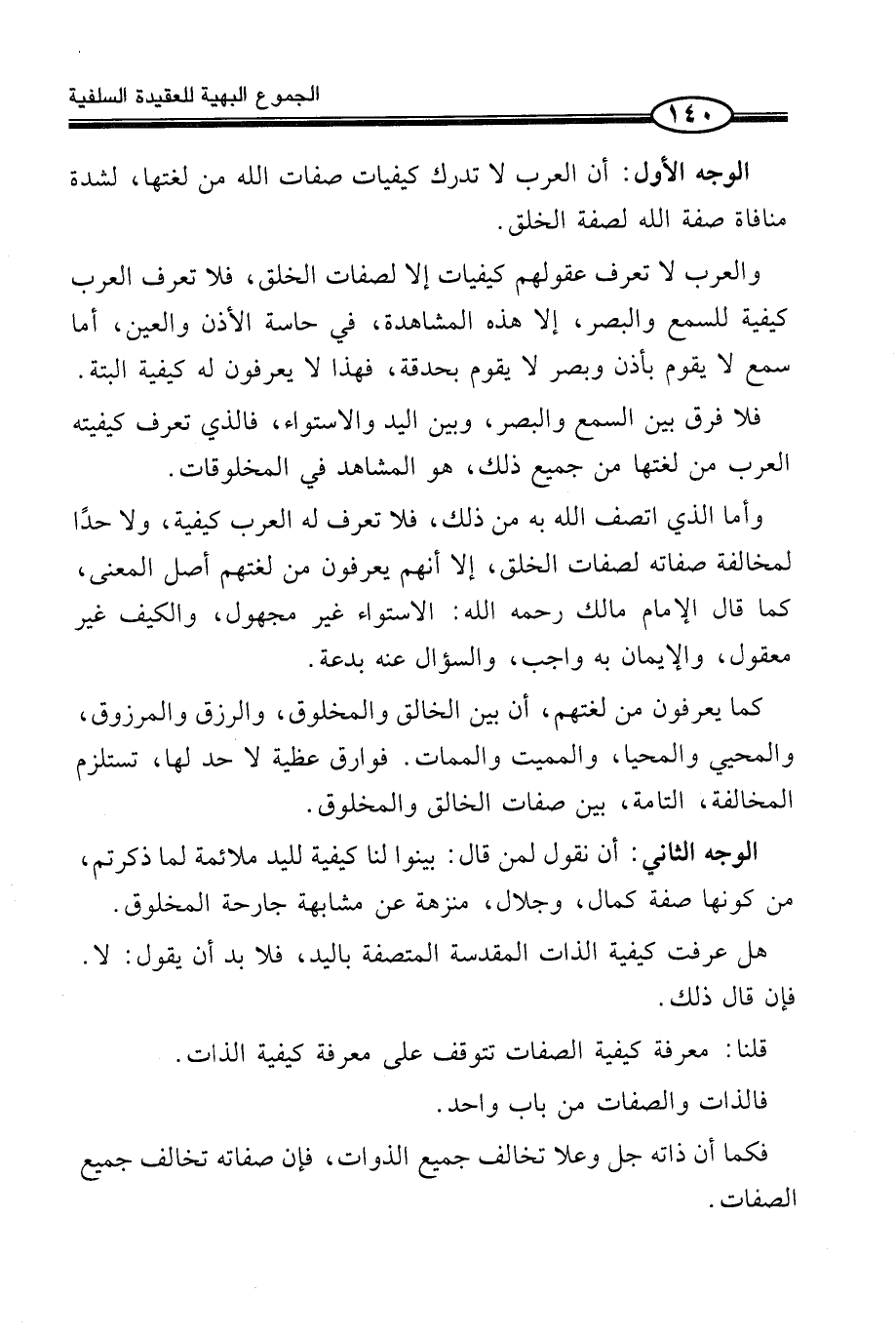 وَأَمَّا الَّذِي اتَّصَفَ اللَّهُ بِهِ مِنْ ذَلِكَ، فَلَا تَعْرِفُ لَهُ الْعَرَبُ كَيْفِيَّةً، وَلَا حَدًّا لِمُخَالَفَةِ صِفَاتِهِ لِصِفَاتِ الْخَلْقِ، إِلَّا أَنَّهُمْ يَعْرِفُونَ مِنْ لُغَتِهِمْ أَصْلَ الْمَعْنَى، كَمَا قَالَ الْإِمَامِ مَالِكٍ رَحِمَهُ اللَّهُ: الِاسْتِوَاءُ غَيْرُ مَجْهُولٍ، وَالْكَيْفُ غَيْرُ مَعْقُولٍ، وَالْإِيمَانُ بِهِ وَاجِبٌ، وَالسُّؤَالُ عَنْهُ بِدَعَةٌ.