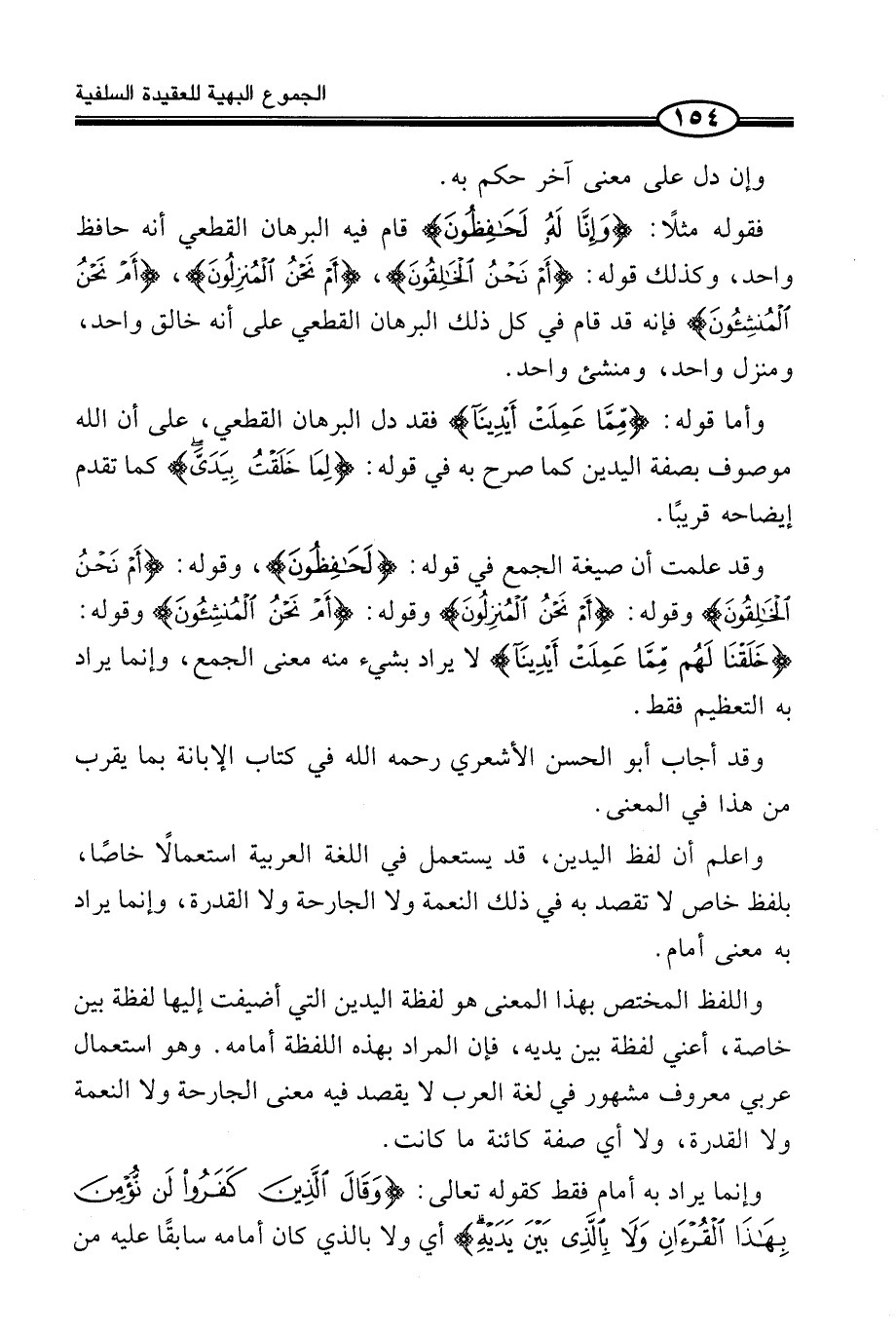 وَاللَّفْظُ الْمُخْتَصُّ بِهَذَا الْمَعْنَى هُوَ لَفْظَةُ الْيَدَيْنِ الَّتِي أُضِيفَتْ إِلَيْهَا لَفْظَةُ بَيْنَ خَاصَّةً، أَعْنِي لَفْظَةَ بَيْنَ يَدَيْهِ، فَإِنَّ الْمُرَادَ بِهَذِهِ اللَّفْظَةِ أَمَامُهُ. وَهُوَ اسْتِعْمَالٌ عَرَبِيٌّ مَعْرُوفٌ مَشْهُورٌ فِي لُغَةِ الْعَرَبِ لَا يُقْصَدُ فِيهِ مَعْنَى الْجَارِحَةِ وَلَا النِّعْمَةِ وَلَا الْقُدْرَةِ، وَلَا أَيَّ صِفَةٍ كَائِنَةٍ مَا كَانَتْ.