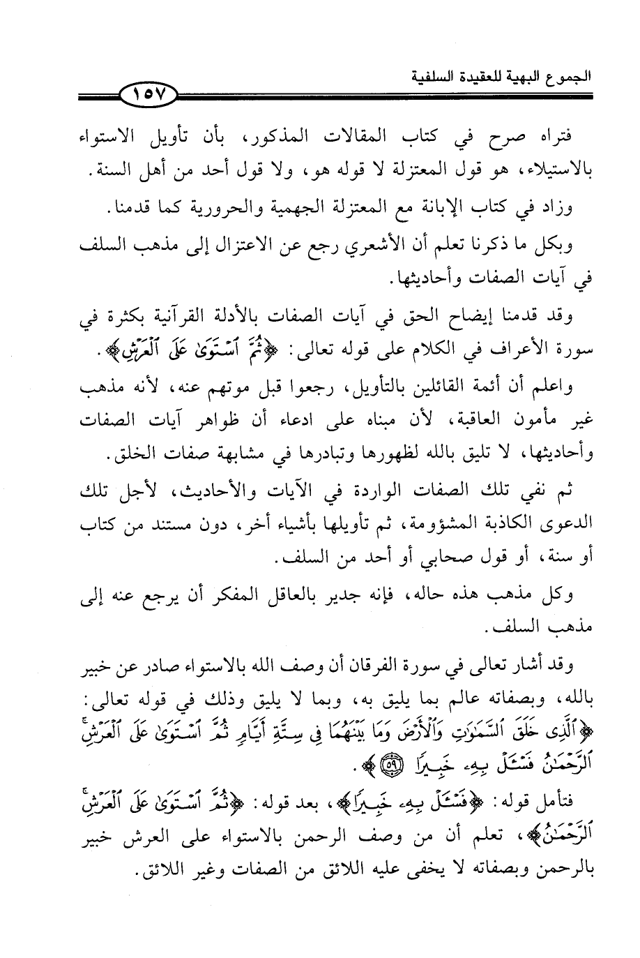 فَتَأَمَّلْ قَوْلَهُ: {فَاسْأَلْ بِهِ خَبِيراً} ، بَعْدَ قَوْلِهِ: {ثُمَّ اسْتَوَى عَلَى الْعَرْشِ الرَّحْمَانُ} ، تَعْلَمُ أَنَّ مَنْ وَصَفَ الرَّحْمَنَ بِالِاسْتِوَاءِ عَلَى الْعَرْشِ خَبِيرٌ بِالرَّحْمَنِ وَبِصِفَاتِهِ لَا يَخْفَى عَلَيْهِ اللَّائِقُ مِنَ الصِّفَاتِ وَغَيْرُ اللَّائِقِ.