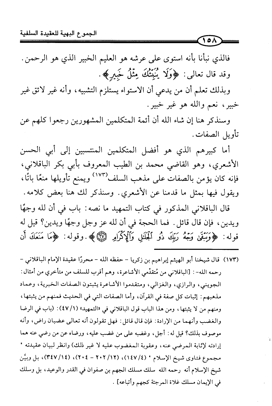 (¬1) - قَالَ شَيخنَا أَبُو الْهَيْثَم إِبْرَاهِيم بن زَكَرِيَّا - حفظه الله - محرراً عقيدة الإِمَام الباقلاني - رَحمَه الله -: [الباقلاني من مُتقدِّمي الأشاعرة، وهم أقرب للسلف من متأخريهم من أَمْثَال: الْجُوَيْنِيّ، والرازي، وَالْغَزالِيّ. ومتقدموا الأشاعرة يثبتون الصِّفَات الخبرية، وعماد مَذْهَبهم: إِثْبَات كل صفة فِي الْقُرْآن، وَأما الصِّفَات الَّتِي فِي الحَدِيث فَمنهمْ من يثبتها، وَمِنْهُم من لَا يثبتها، وَمن هَذَا الْبَاب قَول الباقلاني فِي "التَّمْهِيد" (1/47) : (بَاب فِي الرِّضَا وَالْغَضَب وأنهما من الْإِرَادَة: فَإِن قَالَ قَائِل: فَهَل تَقولُونَ أَنه تَعَالَى عضبان رَاض، وَأَنه مَوْصُوف بذلك؟ قيل لَهُ: أجل، وغضبه على من غضب عَلَيْهِ، وَرضَاهُ عَن من رَضِي عَنهُ هما إِرَادَته لإثابة المرضي عَنهُ، وعقوبة المغضوب عَلَيْهِ لَا غير ذَلِك) وَانْظُر لبَيَان عقيدته " مَجْمُوع فَتَاوَى شيخ الْإِسْلَام " (4/147) ، (12/202 - 204) ، (14/347) ، بل وبيَّن شيخ الْإِسْلَام أَنه - رَحمَه الله - سلك مَسْلَك الجهم بن صَفْوَان فِي الْقدر والوعيد، بل وسلك فِي الْإِيمَان مَسْلَك غلاة المرجئة كجهم وَأَتْبَاعه] .