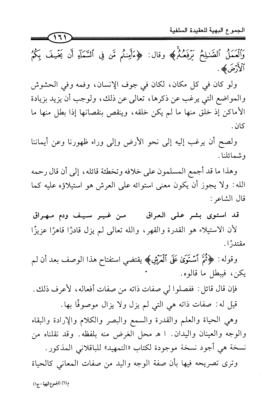 وَهِيَ الْحَيَاةُ وَالْعِلْمُ وَالْقُدْرَةُ وَالسَّمْعُ وَالْبَصَرُ وَالْكَلَام والإرادة والبقاء وَالْوَجْه والعينان وَالْيَدَانِ. اهـ مَحَلُّ الْغَرَضِ مِنْهُ بِلَفْظِهِ. وَقَدْ نَقَلْنَاهُ مِنْ نُسْخَةٍ هِيَ أَجْوَدُ نُسْخَةٍ مَوْجُودَةٍ لِكِتَابِ "التَّمْهِيدِ" لِلْبَاقِلَانِيِّ الْمَذْكُورِ.