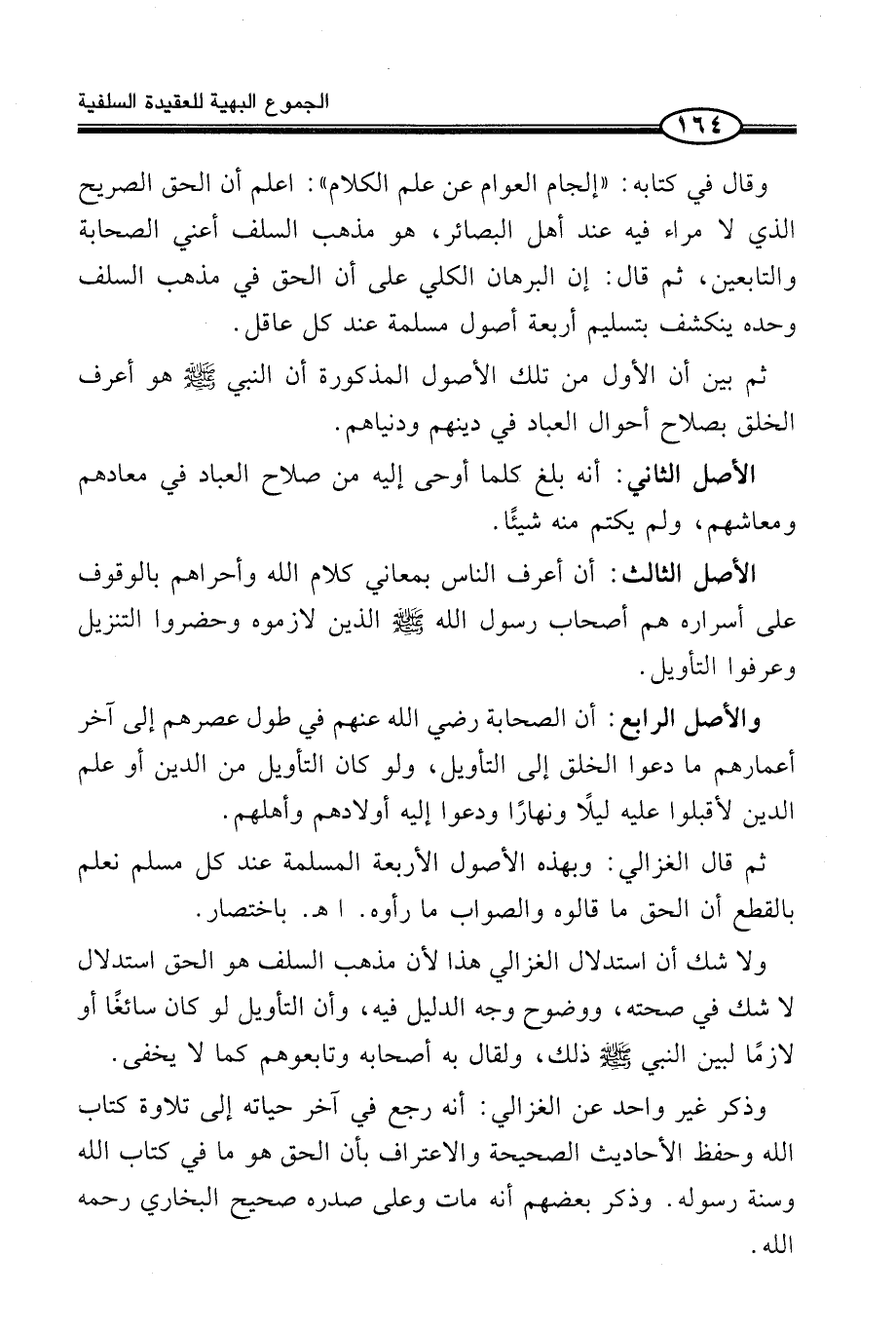 وَقَالَ فِي كِتَابِهِ: " إِلْجَامُ الْعَوَامِّ عَنْ عِلْمِ الْكَلَامِ ": اعْلَمْ أَنَّ الْحَقَّ الصَّرِيحَ الَّذِي لَا مِرَاءَ فِيهِ عِنْدَ أَهْلِ الْبَصَائِرِ، هُوَ مَذْهَبُ السَّلَفِ أَعْنِي الصَّحَابَةَ وَالتَّابِعَيْنِ، ثُمَّ قَالَ: إِنَّ الْبُرْهَانَ الْكُلِّيَّ عَلَى أَنَّ الْحَقَّ فِي مَذْهَبِ السَّلَفِ وَحْدَهُ يَنْكَشِفُ بِتَسْلِيمِ أَرْبَعَةِ أُصُولٍ مُسَلَّمَةٍ عِنْدَ كُلِّ عَاقِلٍ.