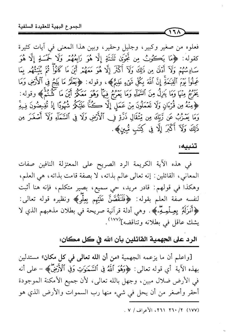 [وَاعْلَمْ أَنَّ مَا يَزْعُمُهُ الْجَهْمِيَّةُ «مِنْ أَنَّ اللَّهَ تَعَالَى فِي كُلِّ مَكَانٍ» مُسْتَدِلِّينَ بِهَذِهِ الْآيَة - أَي قَوْلُهُ تَعَالَى: (وَهُوَ اللَّهُ فِي السَّمَاوَاتِ وَفِي الْأَرْض) - عَلَى أَنَّهُ فِي الْأَرْضِ ضَلَالٌ مُبِينٌ، وَجَهْلٌ بِاللَّهِ تَعَالَى، لِأَنَّ جَمِيعَ الْأَمْكِنَةِ الْمَوْجُودَةِ أَحْقَرُ وَأَصْغَرُ مِنْ أَنْ يَحِلَّ فِي شَيْءٍ مِنْهَا رب السَّمَاوَات وَالْأَرْض الَّذِي هُوَ