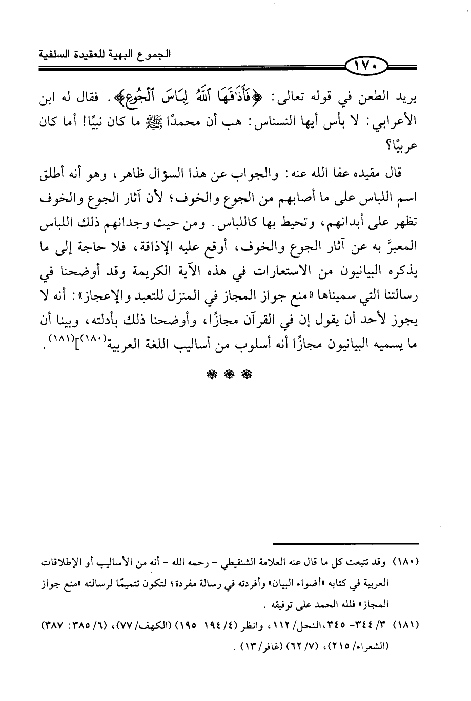 (¬1) - وَقد تتبعت كل مَا قَالَ عَنهُ الْعَلامَة الشنقيطي - رَحمَه الله - أَنه من الأساليب أَو الإطلاقات الْعَرَبيَّة فِي كِتَابه " أضواء الْبَيَان" وأفردته فِي رِسَالَة مُفْردَة؛ لتَكون تتميماً لرسالته " منع جَوَاز الْمجَاز " فَللَّه الْحَمد على توفيقه.
