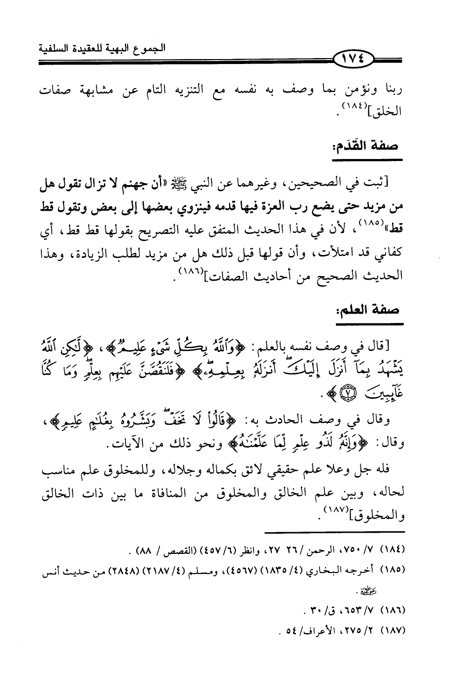 [ثَبَتَ فِي الصَّحِيحَيْنِ، وَغَيْرِهِمَا عَنِ النَّبِيِّ صَلَّى اللَّهُ عَلَيْهِ وَسَلَّمَ «أَنَّ جَهَنَّمَ لَا تَزَالُ تَقُولُ هَلْ مِنْ مَزِيدٍ حَتَّى يَضَعَ رَبُّ الْعِزَّةِ فِيهَا قَدَمَهُ فَيَنْزَوِي بَعْضُهَا إِلَى بَعْضٍ وَتَقُولُ قَطْ قَطْ» (¬2) ، لِأَنَّ فِي هَذَا الْحَدِيثِ الْمُتَّفَقِ عَلَيْهِ التَّصْرِيحَ بِقَوْلِهَا قَطْ قَطْ، أَيْ كَفَانِي قَدِ امْتَلَأْتُ، وَأَنَّ قَوْلَهَا قَبْلَ ذَلِكَ هَلْ مِنْ مَزِيدٍ لِطَلَبِ الزِّيَادَةِ، وَهَذَا الْحَدِيثُ الصَّحِيح من أَحَادِيث الصِّفَات] (¬3) .