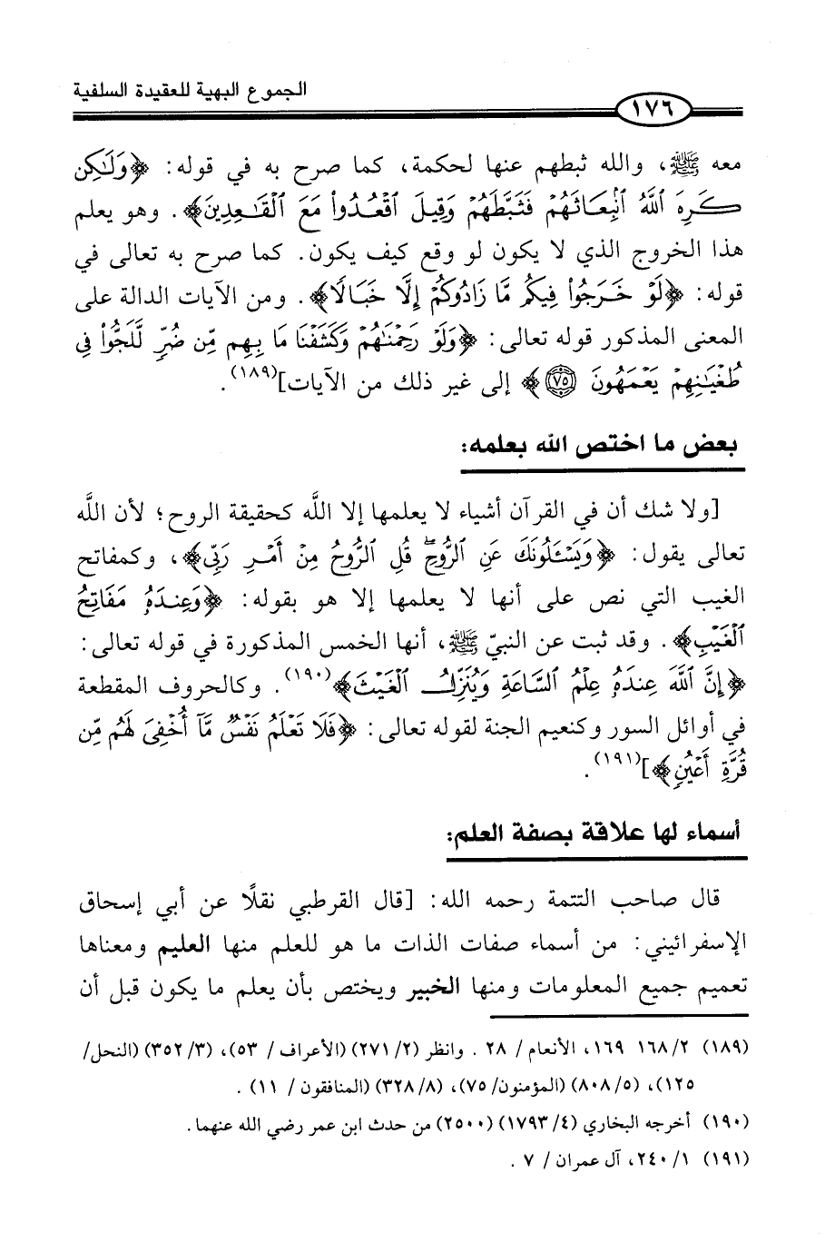[وَلَا شَكَّ أَنَّ فِي الْقُرْآنِ أَشْيَاءَ لَا يَعْلَمُهَا إِلَّا اللَّه كَحَقِيقَةِ الرُّوحِ؛ لِأَنَّ اللَّه تَعَالَى يَقُول: {وَيَسْئَلُونَكَ عَنِ الرُّوحِ قُلِ الرُّوحُ مِنْ أَمْرِ رَبّى} ، وَكَمَفَاتِحِ الْغَيْبِ الَّتِي نَصَّ عَلَى أَنَّهَا لَا يَعْلَمُهَا إِلَّا هُوَ بِقَوْلِهِ: {وَعِندَهُ مَفَاتِحُ الْغَيْبِ} . وَقَدْ ثَبَتَ عَنِ النَّبِيِّ صَلَّى اللَّهُ عَلَيْهِ وَسَلَّمَ، أَنَّهَا الْخَمْسُ الْمَذْكُورَةُ فِي قَوْلِهِ تَعَالَى: {إِنَّ اللَّهَ عِندَهُ عِلْمُ السَّاعَةِ وَيُنَزّلُ الْغَيْثَ} (¬2) . وَكَالْحُرُوفِ الْمُقَطَّعَةِ فِي أَوَائِلِ السُّوَرِ وَكَنَعِيمِ الْجَنَّةِ لِقَوْلِهِ تَعَالَى: {فَلاَ تَعْلَمُ نَفْسٌ مَّا أُخْفِىَ لَهُم مِنْ قُرَّةِ أَعْيُنٍ} ] (¬3) .