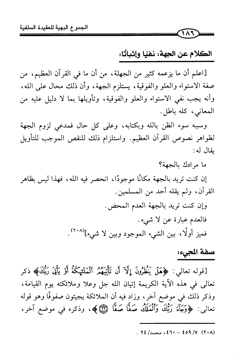 [اعْلَم أَنَّ مَا يَزْعُمُهُ كَثِيرٌ مِنَ الْجَهَلَةِ، مِنْ أَنَّ مَا فِي الْقُرْآنِ الْعَظِيمِ، مِنْ صِفَةِ الِاسْتِوَاءِ وَالْعُلُوِّ وَالْفَوْقِيَّةِ، يَسْتَلْزِمُ الْجِهَةَ، وَأَنَّ ذَلِكَ مُحَالٌ عَلَى اللَّهِ، وَأَنَّهُ يَجِبُ نَفْيُ الِاسْتِوَاءِ وَالْعُلُوِّ وَالْفَوْقِيَّةِ، وَتَأْوِيلُهَا بِمَا لَا دَلِيلَ عَلَيْهِ مِنَ الْمَعَانِي، كُلُّهُ بَاطِلٌ.