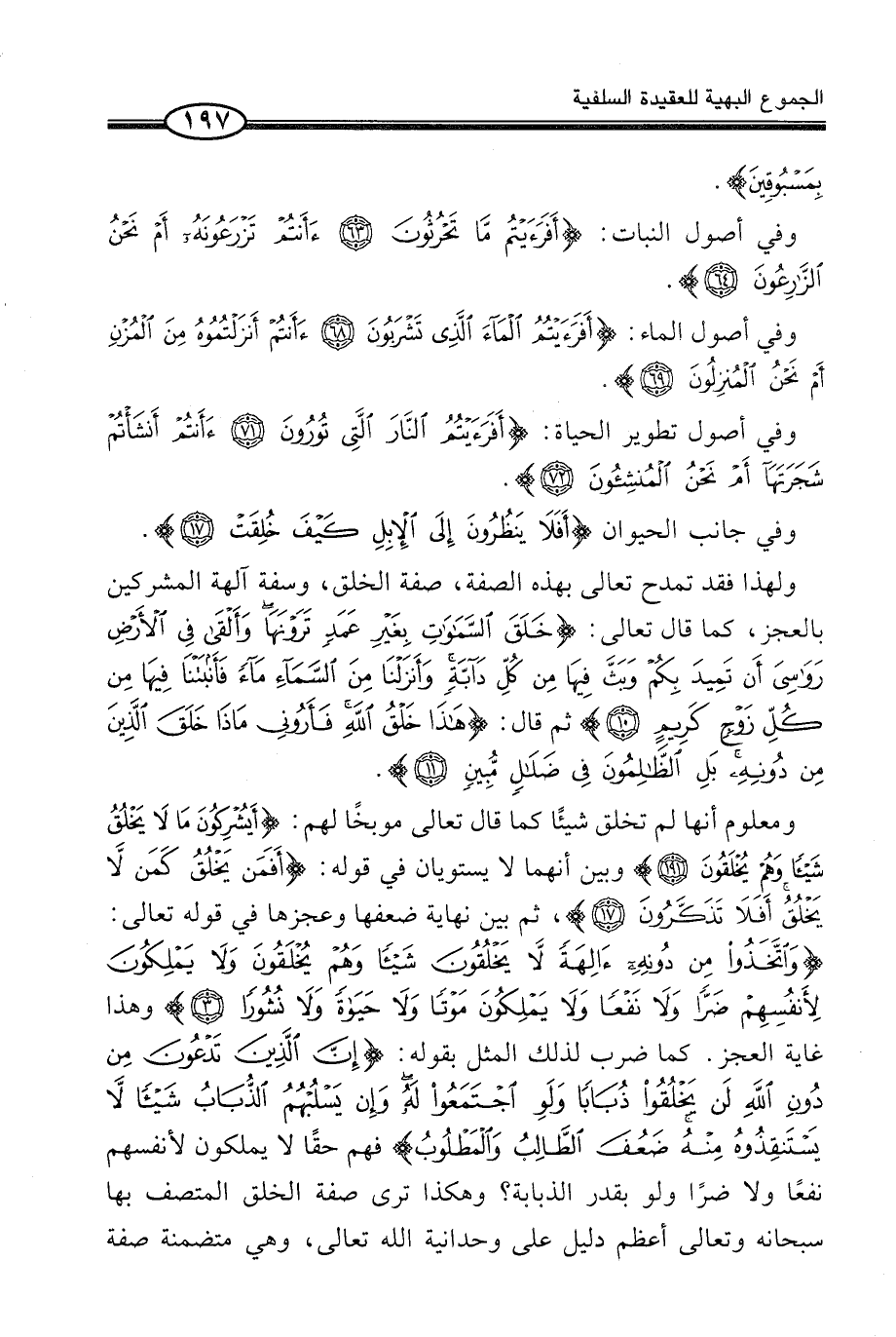 وَمَعْلُومٌ أَنَّهَا لَمْ تَخْلُقْ شَيْئًا كَمَا قَالَ تَعَالَى مُوَبِّخًا لَهُمْ: {أَيُشْرِكُونَ مَا لاَ يَخْلُقُ شَيْئاً وَهُمْ يُخْلَقُونَ} وَبَيَّنَ أَنَّهُمَا لَا يَسْتَوِيَانِ فِي قَوْلِهِ: {أَفَمَن يَخْلُقُ كَمَن لاَّ يَخْلُقُ أَفَلا تَذَكَّرُونَ} ، ثُمَّ بَيَّنَ نِهَايَةَ ضَعْفِهَا وَعَجْزِهَا فِي قَوْلِهِ تَعَالَى: {وَاتَّخَذُواْ مِن دُونِهِ آلِهَةً لاَّ يَخْلُقُونَ شَيْئاً وَهُمْ يُخْلَقُونَ وَلاَ يَمْلِكُونَ لاًّنفُسِهِمْ ضَرّاً وَلاَ نَفْعاً وَلاَ يَمْلِكُونَ مَوْتاً وَلاَ حَيَاةً وَلاَ نُشُوراً} وَهَذَا غَايَةُ الْعَجْزِ. كَمَا ضَرَبَ لِذَلِكَ الْمَثَلَ بِقَوْلِهِ: {إِنَّ الَّذِينَ تَدْعُونَ مِن دُونِ اللَّهِ لَن يَخْلُقُواْ ذُبَاباً وَلَوِ اجْتَمَعُواْ لَهُ وَإِن يَسْلُبْهُمُ الذُّبَابُ شَيْئاً لاَّ يَسْتَنقِذُوهُ مِنْهُ ضَعُفَ الطَّالِبُ وَالْمَطْلُوبُ} فَهُمْ حَقًّا لَا يَمْلِكُونَ لِأَنْفُسِهِمْ نَفْعًا وَلَا ضَرًّا وَلَوْ بِقَدْرِ الذُّبَابَةِ؟ وَهَكَذَا تَرَى صِفَةَ الْخَلْقِ الْمُتَّصِفِ بِهَا سُبْحَانَهُ وَتَعَالَى أَعْظَمَ دَلِيلٍ عَلَى وَحْدَانِيَّةِ اللَّهِ تَعَالَى، وَهِيَ مُتَضَمِّنَةٌ صِفَةَ
