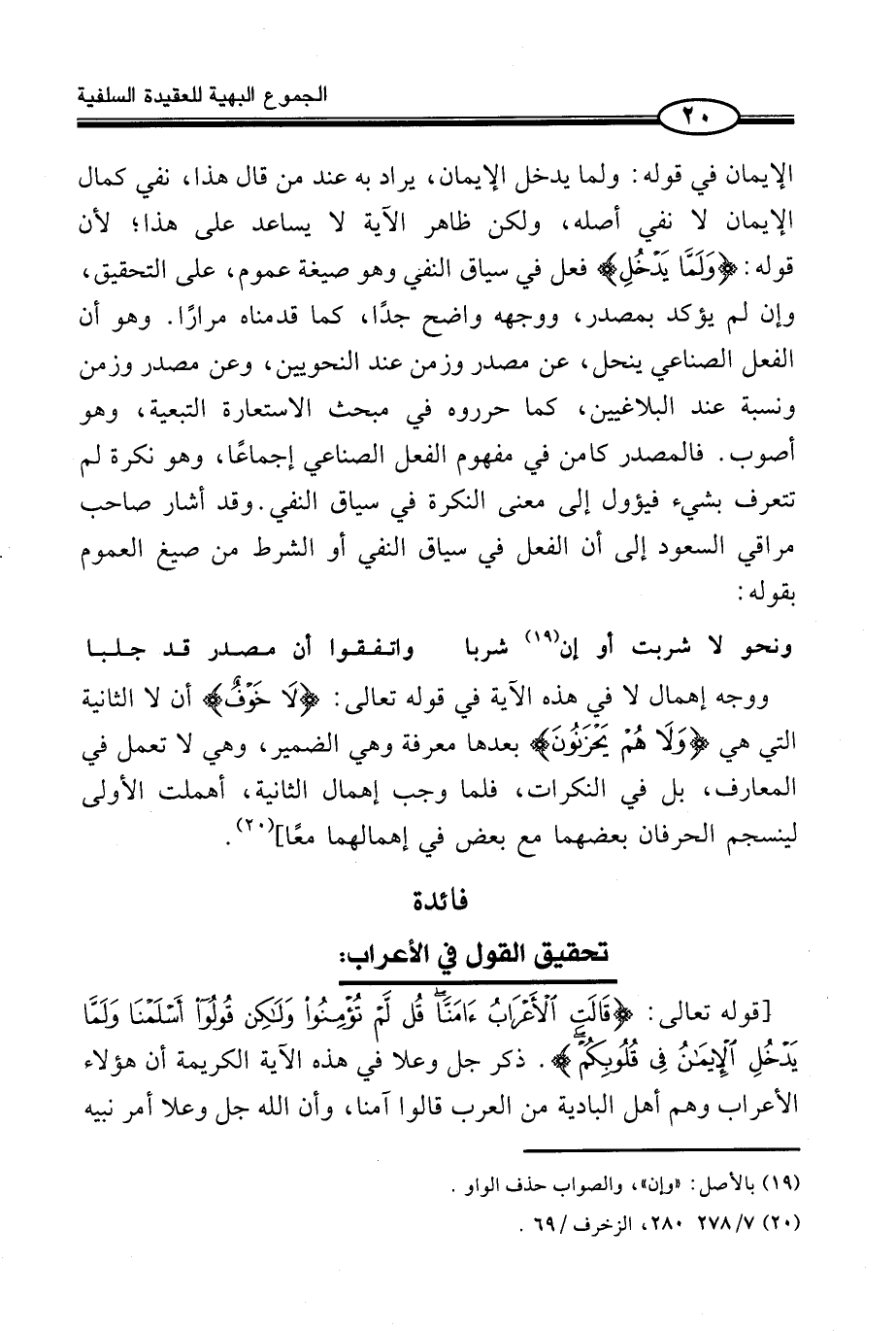 الْإِيمَانِ فِي قَوْلِهِ: وَلَمَّا يَدْخُلِ الْإِيمَانُ، يُرَادُ بِهِ عِنْدَ مَنْ قَالَ هَذَا، نَفْيُ كَمَالِ الْإِيمَانِ لَا نَفْيُ أَصْلِهِ، وَلَكِنْ ظَاهِرُ الْآيَةِ لَا يُسَاعِدُ عَلَى هَذَا؛ لِأَنَّ قَوْلَهُ: (وَلَمَّا يَدْخُلِ) فِعْلٌ فِي سِيَاقِ النَّفْيِ وَهُوَ صِيغَةُ عُمُومٍ، عَلَى التَّحْقِيقِ، وَإِنْ لَمْ يُؤَكَّدْ بِمَصْدَرٍ، وَوَجْهُهُ وَاضِحٌ جِدًّا، كَمَا قَدَّمْنَاهُ مِرَارًا. وَهُوَ أَنَّ الْفِعْلَ الصِّنَاعِيَّ يَنْحَلُّ، عَنْ مَصْدَرٍ وَزَمَنٍ عِنْدَ النَّحْوِيِّينَ، وَعَنْ مَصْدَرٍ وَزَمَنٍ وَنِسْبَةٍ عِنْدَ الْبَلَاغِيِّينَ، كَمَا حَرَّرُوهُ فِي مَبْحَثِ الِاسْتِعَارَةِ التَّبَعِيَّةِ، وَهُوَ أَصْوَبُ. فَالْمَصْدَرُ كَامِنٌ فِي مَفْهُومِ الْفِعْلِ الصِّنَاعِيِّ إِجْمَاعًا، وَهُوَ نَكِرَةٌ لَمْ تَتَعَرَّفْ بِشَيْءٍ فَيُؤَوَّلُ إِلَى مَعْنَى النَّكِرَةِ فِي سِيَاقِ النَّفْيِ. وَقَدْ أَشَارَ صَاحِبُ مَرَاقِي السُّعُودِ إِلَى أَنَّ الْفِعْلَ فِي سِيَاقِ النَّفْيِ أَوِ الشَّرْطِ مِنْ صِيَغِ الْعُمُوم بقوله: