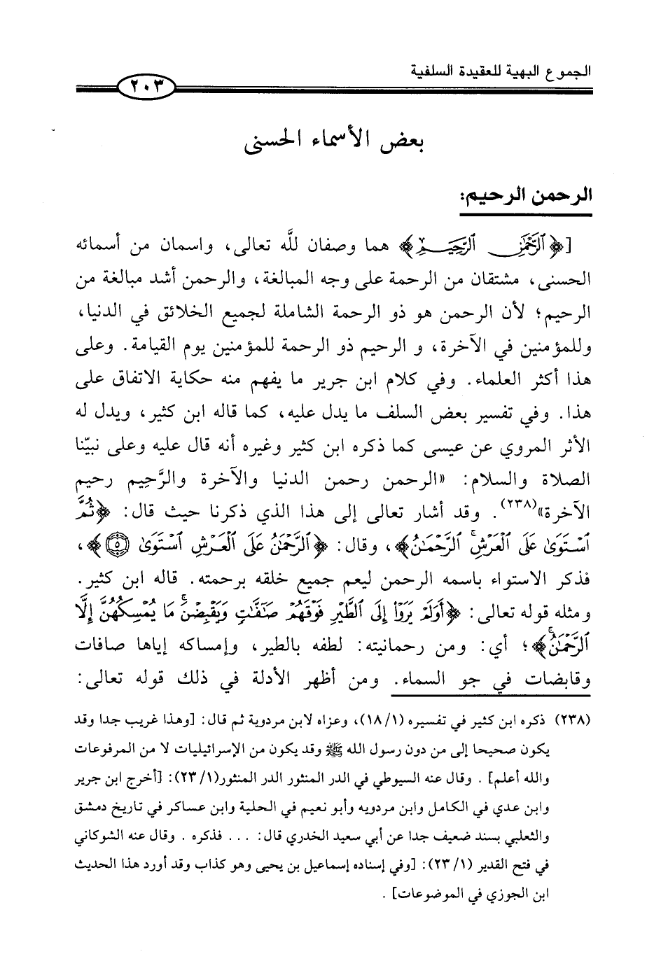 [ {الرَّحْمَنِ الرَّحِيمِ} همَا وَصْفَانِ للَّه تَعَالَى، وَاسْمَانِ مِنْ أَسْمَائِهِ الْحُسْنَى، مُشْتَقَّانِ مِنَ الرَّحْمَةِ عَلَى وَجْهِ الْمُبَالَغَةِ، وَالرَّحْمَنُ أَشَدُّ مُبَالَغَةً مِنَ الرَّحِيمِ؛ لِأَنَّ الرَّحْمَنَ هُوَ ذُو الرَّحْمَةِ الشَّامِلَةِ لِجَمِيعِ الْخَلَائق فِي الدُّنْيَا، وَلِلْمُؤْمنِينَ فِي الْآخِرَة، والرَّحِيم ذُو الرَّحْمَةِ لِلْمُؤْمِنِينَ يَوْمَ الْقِيَامَةِ. وَعَلَى هَذَا أَكْثَرُ الْعُلَمَاءِ. وَفِي كَلَامِ ابْنِ جَرِيرٍ مَا يُفْهَمُ مِنْهُ حِكَايَةُ الِاتِّفَاقِ عَلَى هَذَا. وَفِي تَفْسِيرِ بَعْضِ السَّلَفِ مَا يَدُلُّ عَلَيْهِ، كَمَا قَالَهُ ابْنُ كَثِيرٍ، وَيَدُلُّ لَهُ الْأَثَرُ الْمَرْوِيُّ عَنْ عِيسَى كَمَا ذَكَرَهُ ابْنُ كَثِيرٍ وَغَيْرُهُ إِنَّهُ قَالَ عَلَيْهِ وَعَلَى نَبِيِّنَا الصَّلَاةُ وَالسَّلَامُ: (الرَّحْمَنُ رَحْمَنُ الدُّنْيَا وَالْآخِرَةِ والرَّحِيم رَحِيمُ الْآخِرَةِ) (¬1) . وَقَدْ أَشَارَ تَعَالَى إِلَى هَذَا الَّذِي ذَكَرْنَا حَيْثُ قَالَ: {ثُمَّ اسْتَوَى عَلَى الْعَرْشِ الرَّحْمَنُ} ، وَقَالَ: {الرَّحْمَنُ عَلَى الْعَرْشِ اسْتَوَى} ، فَذَكَرَ الِاسْتِوَاءَ بِاسْمِهِ الرَّحْمَنُ لِيَعُمَّ جَمِيعَ خَلْقِهِ بِرَحْمَتِهِ. قَالَهُ ابْنُ كَثِيرٍ. وَمِثْلُهُ قَوْلُهُ تَعَالَى: {أَوَلَمْ يَرَوْا إِلَى الطَّيْرِ فَوْقَهُمْ صَافَّاتٍ وَيَقْبِضْنَ مَا يُمْسِكُهُنَّ إِلاَّ الرَّحْمَنُ} ؛ أَيْ: وَمِنْ رَحْمَانِيَّتِهِ: لُطْفُهُ بِالطَّيْرِ، وَإِمْسَاكُهُ إِيَّاهَا صَافَّاتٍ وَقَابِضَاتٍ فِي جَوِّ السَّمَاءِ.
