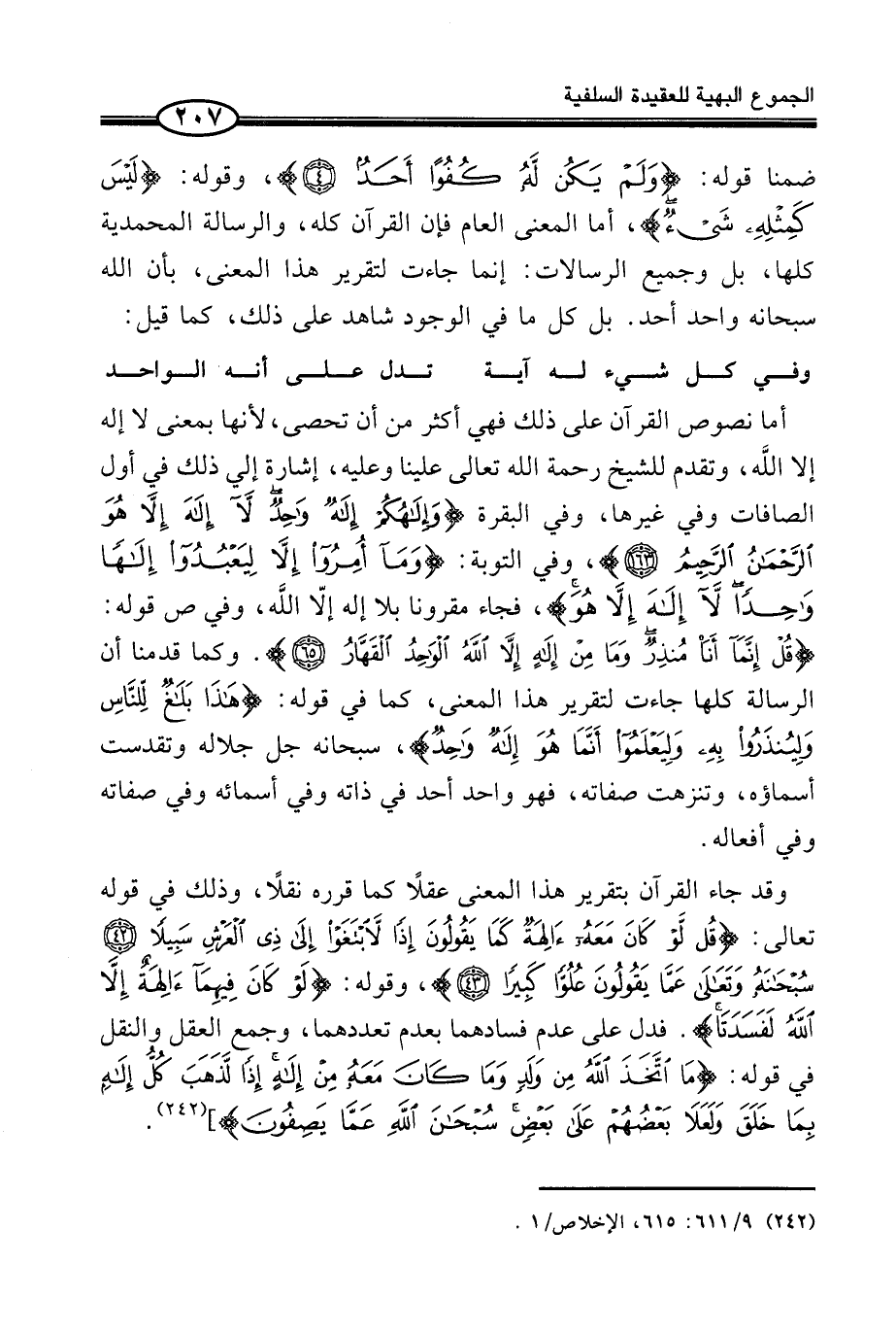 أَمَّا نُصُوصُ الْقُرْآنِ عَلَى ذَلِكَ فَهِيَ أَكْثَرُ مِنْ أَنْ تُحْصَى، لِأَنَّهَا بِمَعْنَى لَا إِلَهَ إِلَّا اللَّه، وَتَقَدَّمَ لِلشَّيْخِ رَحْمَةُ اللَّهِ تَعَالَى عَلَيْنَا وَعَلَيْهِ، إِشَارَةٌ إِلَى ذَلِكَ فِي أَوَّلِ الصَّافَّاتِ وَفِي غَيْرِهَا، وَفِي الْبَقَرَةِ {وَإِلَهُكُمْ إِلَهٌ وَاحِدٌ لاَّ إِلَهَ إِلاَّ هُوَ الرَّحْمَنُ الرَّحِيمُ} ، وَفِي التَّوْبَةِ: {وَمَآ أُمِرُواْ إِلاَّ لِيَعْبُدُواْ إِلَهًا وَاحِداً لاَّ إِلَهَ إِلاَّ هُوَ} ، فَجَاءَ مَقْرُونًا بِلَا إِلَهَ إلاَّ اللَّه، وَفِي ص قَوْلُهُ: {قُلْ إِنَّمَآ أَنَاْ مُنذِرٌ وَمَا مِنْ إِلَهٍ إِلاَّ اللَّهُ الْوَاحِدُ الْقَهَّارُ} . وَكَمَا قَدَّمْنَا أَنَّ الرِّسَالَةَ كُلَّهَا جَاءَتْ لِتَقْرِيرِ هَذَا الْمَعْنَى، كَمَا فِي قَوْلِهِ: {هَذَا بَلَاغٌ لِّلنَّاسِ وَلِيُنذَرُواْ بِهِ وَلِيَعْلَمُواْ أَنَّمَا هُوَ إِلَهٌ وَاحِدٌ} ، سُبْحَانَهُ جَلَّ جَلَالُهُ وَتَقَدَّسَتْ أَسْمَاؤُهُ، وَتَنَزَّهَتْ صِفَاتُهُ، فَهُوَ وَاحِدٌ أَحَدٌ فِي ذَاتِهِ وَفِي أَسْمَائِهِ وَفِي صِفَاتِهِ وَفِي أَفْعَالِهِ.