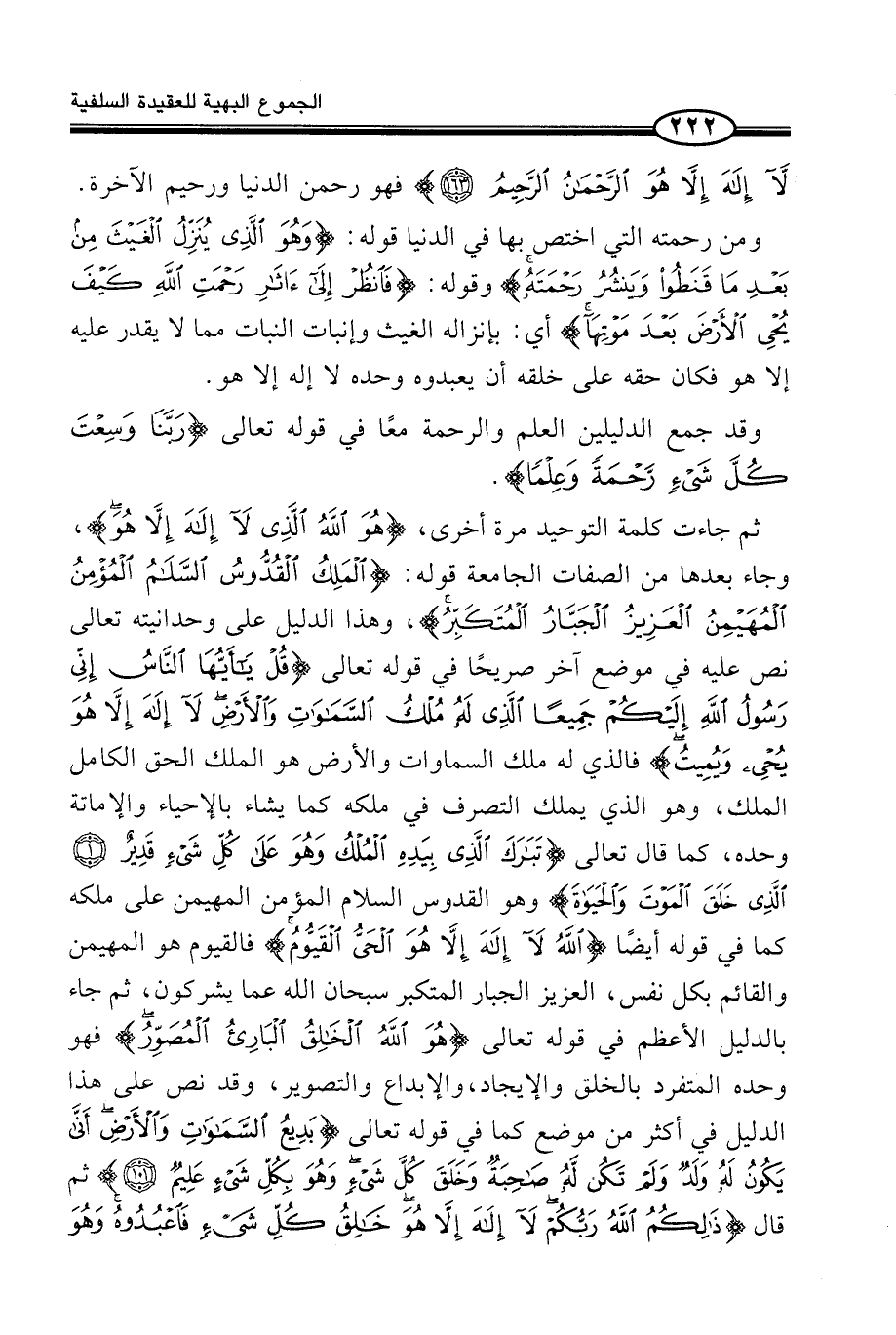 ثُمَّ جَاءَتْ كَلِمَةُ التَّوْحِيدِ مَرَّةً أُخْرَى، {هُوَ اللَّهُ الَّذِى لاَ إِلَهَ إِلاَّ هُوَ} ، وَجَاءَ بَعْدَهَا مِنَ الصِّفَاتِ الْجَامِعَةِ قَوْلُهُ: {الْمَلِكُ الْقُدُّوسُ السَّلَامُ الْمُؤْمِنُ الْمُهَيْمِنُ الْعَزِيزُ الْجَبَّارُ الْمُتَكَبِّرُ} ، وَهَذَا الدَّلِيلُ عَلَى وَحْدَانِيَّتِهِ تَعَالَى نَصَّ عَلَيْهِ فِي مَوْضِعٍ آخَرَ صَرِيحًا فِي قَوْلُهُ تَعَالَى {قُلْ يَا أَيُّهَا النَّاسُ إِنِّي رَسُولُ اللَّهِ إِلَيْكُمْ جَمِيعاً الَّذِي لَهُ مُلْكُ السَّمَوَاتِ وَالأَرْضِ لاَ إِلَهَ إِلاَّ هُو يُحْيِي وَيُمِيتُ} فَالَّذِي لَهُ مُلْكُ السَّمَاوَاتِ وَالْأَرْضِ هُوَ الْمَلِكُ الْحَقُّ الْكَامِلُ الْمُلْكِ، وَهُوَ الَّذِي يَمْلِكُ التَّصَرُّفَ فِي مُلْكِهِ كَمَا يَشَاءُ بِالْإِحْيَاءِ وَالْإِمَاتَةِ وَحْدَهُ، كَمَا قَالَ تَعَالَى {تَبَارَكَ الَّذِى بِيَدِهِ الْمُلْكُ وَهُوَ عَلَى كُلِّ شَىْءٍ قَدِيرٌ الَّذِى خَلَقَ الْمَوْتَ وَالْحياةَ} وَهُوَ الْقُدُّوسُ السَّلَامُ الْمُؤْمِنُ الْمُهَيْمِنُ عَلَى مُلْكِهِ كَمَا فِي قَوْلِهِ أَيْضًا {اللَّهُ لاَ إِلَهَ إِلاَّ هُوَ الْحَىُّ الْقَيُّومُ} فَالْقَيُّومُ هُوَ الْمُهَيْمِنُ وَالْقَائِمُ بِكُلِّ نَفْسٍ، الْعَزِيزُ الْجَبَّارُ الْمُتَكَبِّرُ سُبْحَانَ اللَّهِ عَمَّا يُشْرِكُونَ، ثُمَّ جَاءَ بِالدَّلِيلِ الْأَعْظَمِ فِي قَوْلِهِ تَعَالَى {هُوَ اللَّهُ الْخَالِقُ الْبَارِىءُ الْمُصَوِّرُ} فَهُوَ وَحْدَهُ الْمُتَفَرِّدُ بِالْخَلْقِ وَالْإِيجَادِ، وَالْإِبْدَاعِ وَالتَّصْوِيرِ، وَقَدْ نَصَّ عَلَى هَذَا الدَّلِيلِ فِي أَكْثَرَ مِنْ مَوْضِعٍ كَمَا فِي قَوْلِهِ تَعَالَى {بَدِيعُ السَّمَوَاتِ وَالأَرْضِ أَنَّى يَكُونُ لَهُ وَلَدٌ وَلَمْ تَكُنْ لَّهُ صَاحِبَةٌ وَخَلَقَ كُلَّ شَىْءٍ وهُوَ بِكُلِّ شَىْءٍ عَلِيمٌ} ثُمَّ قَالَ {ذلكمُ اللَّهُ رَبُّكُمْ لَا إِلَهَ إِلاَّ هُوَ خَالِقُ كُلِّ شَىْءٍ فَاعْبُدُوهُ وَهُوَ