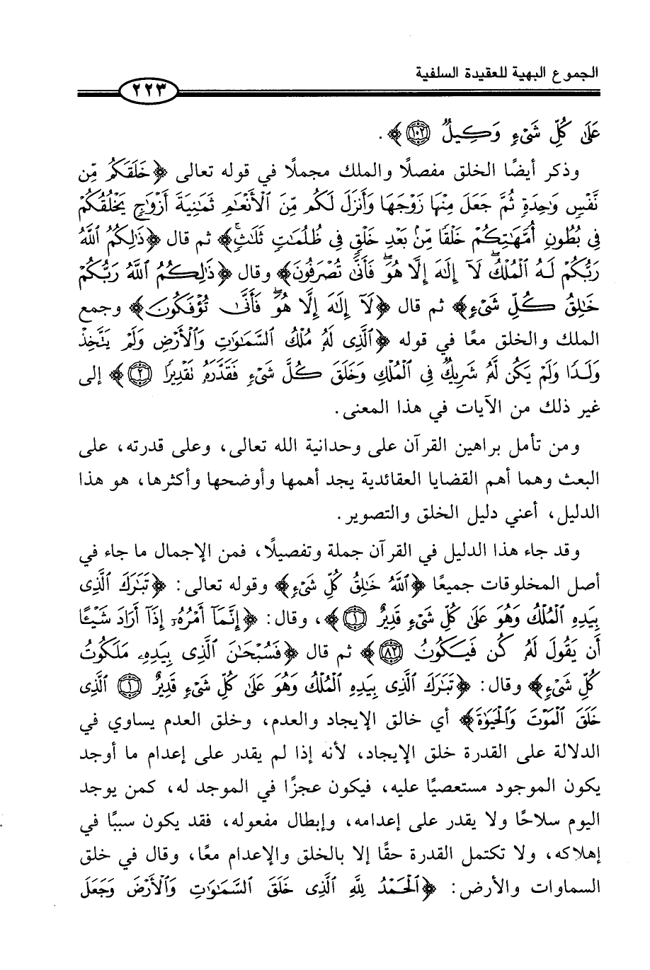 وَقَدْ جَاءَ هَذَا الدَّلِيلُ فِي الْقُرْآنِ جُمْلَةً وَتَفْصِيلًا، فَمِنَ الْإِجْمَالِ مَا جَاءَ فِي أَصْلِ الْمَخْلُوقَاتِ جَمِيعًا {اللَّهُ خَالِقُ كُلِّ شَىْءٍ} وَقَوْلُهُ تَعَالَى: {تَبَارَكَ الَّذِى بِيَدِهِ الْمُلْكُ وَهُوَ عَلَى كُلِّ شَىْءٍ قَدِيرٌ} ، وَقَالَ: {إِنَّمَآ أَمْرُهُ إِذَآ أَرَادَ شَيْئاً أَن يَقُولَ لَهُ كُن فَيَكُونُ} ثُمَّ قَالَ {فَسُبْحَانَ الَّذِى بِيَدِهِ مَلَكُوتُ كُلِّ شَىْءٍ} وَقَالَ: {تَبَارَكَ الَّذِى بِيَدِهِ الْمُلْكُ وَهُوَ عَلَى كُلِّ شَىْءٍ قَدِيرٌ الَّذِى خَلَقَ الْمَوْتَ وَالْحياةَ} أَيْ خَالِقُ الْإِيجَادِ وَالْعَدَمِ، وَخَلْقُ الْعَدَمِ يُسَاوِي فِي الدَّلَالَةِ عَلَى الْقُدْرَةِ خَلْقَ الْإِيجَادِ، لِأَنَّهُ إِذَا لَمْ يَقْدِرْ عَلَى إِعْدَامِ مَا أَوْجَدَ يَكُونُ الْمَوْجُودُ مُسْتَعْصِيًا عَلَيْهِ، فَيَكُونُ عَجْزًا فِي الْمُوجِدِ لَهُ، كَمَنْ يُوجِدُ الْيَوْمَ سِلَاحًا وَلَا يَقْدِرُ عَلَى إِعْدَامِهِ، وَإِبْطَالِ مَفْعُولِهِ، فَقَدْ يَكُونُ سَبَبًا فِي إِهْلَاكِهِ، وَلَا تَكْتَمِلُ الْقُدْرَةُ حَقًّا إِلَّا بِالْخَلْقِ وَالْإِعْدَامِ مَعًا، وَقَالَ فِي خَلْقِ السَّمَاوَاتِ وَالْأَرْضِ: {الْحَمْدُ للَّهِ الَّذِى خَلَقَ السَّمَوَاتِ وَالأَرْضَ وَجَعَلَ