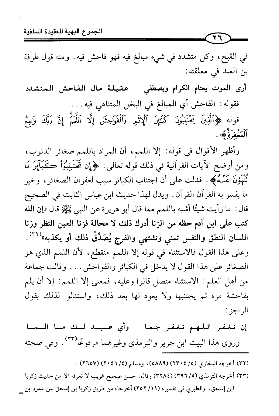وَأَظْهَرُ الْأَقْوَالِ فِي قَوْلِهِ: إِلَّا اللَّمَمَ، أَنَّ الْمُرَادَ بِاللَّمَمِ صَغَائِرُ الذُّنُوبِ، وَمِنْ أَوْضَحِ الْآيَاتِ الْقُرْآنِيَّةِ فِي ذَلِكَ قَوْلُهُ تَعَالَى: (إِن تَجْتَنِبُواْ كَبَائِرَ مَا تُنهَوْنَ عَنْهُ) . فَدَلَّتْ عَلَى أَنَّ اجْتِنَابَ الْكَبَائِرِ سَبَبٌ لِغُفْرَانِ الصَّغَائِرِ، وَخَيْرُ مَا يُفَسَّرُ بِهِ الْقُرْآنُ الْقُرْآنُ. وَيَدُلُّ لِهَذَا حَدِيثُ ابْنِ عَبَّاسٍ الثَّابِتُ فِي الصَّحِيحِ قَالَ: مَا رَأَيْتُ شَيْئًا أَشْبَهَ بِاللَّمَمِ مِمَّا قَالَ أَبُو هُرَيْرَةَ عَنِ النَّبِيِّ صَلَّى اللَّهُ عَلَيْهِ وَسَلَّمَ قَالَ «إِنَّ اللَّهَ كَتَبَ عَلَى ابْنِ آدَمَ حَظَّهُ مِنَ الزِّنَا أَدْرَكَ ذَلِكَ لَا مَحَالَةَ فَزِنَا الْعَيْنِ النَّظَرُ وَزِنَا اللِّسَان النُّطْق وَالنَّفْسُ تُمَنِّي وَتَشْتَهِي وَالْفَرْجُ يُصَدِّقُ ذَلِكَ أَوْ يُكَذِّبُهُ» (¬1) . وَعَلَى هَذَا الْقَوْلِ فَالِاسْتِثْنَاءُ فِي قَوْلِهِ إِلَّا اللَّمَمَ مُنْقَطِعٌ، لِأَنَّ اللَّمَمَ الَّذِي هُوَ الصَّغَائِرُ عَلَى هَذَا الْقَوْلِ لَا يَدْخُلُ فِي الْكَبَائِر وَالْفَوَاحِش ... وَقَالَتْ جَمَاعَةٌ مِنْ أَهْلِ الْعِلْمِ: الِاسْتِثْنَاءُ مُتَّصِلٌ قَالُوا وَعَلَيْهِ، فَمَعْنَى إِلَّا اللَّمَمَ: إِلَّا أَنْ يَلُمَّ بِفَاحِشَةٍ مَرَّةً ثُمَّ يَجْتَنِبُهَا وَلَا يَعُودُ لَهَا بَعْدَ ذَلِكَ، وَاسْتَدَلُّوا لِذَلِكَ بِقَوْلِ الرَّاجِزِ: