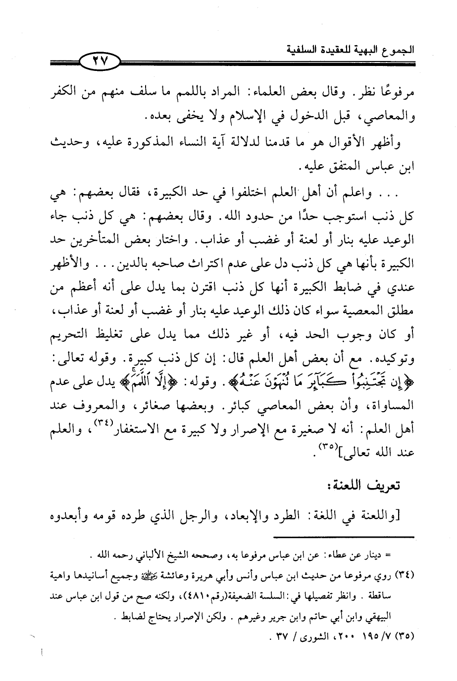 مَرْفُوعا نظر. وَقَالَ بَعْضُ الْعُلَمَاءِ: الْمُرَادُ بِاللَّمَمِ مَا سَلَفَ مِنْهُمْ مَنِ الْكُفْرِ وَالْمَعَاصِي، قَبْلَ الدُّخُولِ فِي الْإِسْلَامِ وَلَا يَخْفَى بُعْدُهُ.