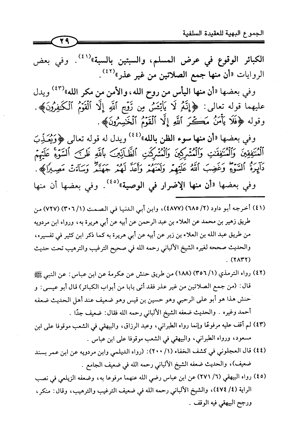 وَفِي بَعْضِهَا «أَنَّ مِنْهَا الْيَأْسَ مِنْ رَوْحِ اللَّهِ، وَالْأَمْنَ مِنْ مَكْرِ اللَّهِ» (¬3) وَيَدُلُّ عَلَيْهِمَا قَوْلُهُ تَعَالَى: (إِنَّهُ لاَ يَيْأَسُ مِن رَّوْحِ اللَّهِ إِلاَّ الْقَوْمُ الْكَافِرُونَ) . وَقَوْلُهُ (فَلاَ يَأْمَنُ مَكْرَ اللَّهِ إِلاَّ الْقَوْمُ الْخَاسِرُونَ) . وَفِي بَعْضِهَا «أَنَّ مِنْهَا سُوءَ الظَّنِّ بِاللَّهِ» (¬4) وَيَدُلُّ لَهُ قَوْلُهُ تَعَالَى (وَيُعَذِّبَ الْمُنَافِقِينَ وَالْمُنَافِقَاتِ وَالْمُشْرِكِينَ وَالْمُشْرِكَاتِ الظَّآنِّينَ بِاللَّهِ ظَنَّ السَّوْءِ عَلَيْهِمْ دَائِرَةُ السَّوْءِ وَغَضِبَ اللَّهُ عَلَيْهِمْ وَلَعَنَهُمْ وَأَعَدَّ لَهُمْ جَهَنَّمَ وَسَاءَتْ مَصِيراً) . وَفِي بَعْضِهَا «أَنَّ مِنْهَا الْإِضْرَارَ فِي الْوَصِيَّةِ» (¬5) . وَفِي بَعْضِهَا أَنَّ مِنْهَا