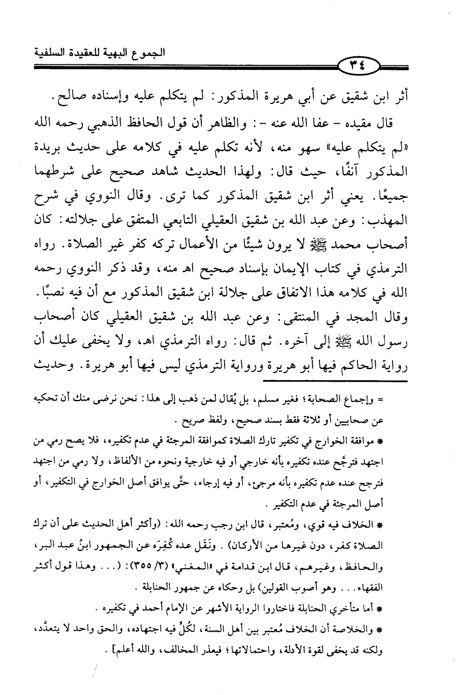 قَالَ مُقَيِّدُهُ - عَفَا اللَّهُ عَنْهُ -: وَالظَّاهِرُ أَنَّ قَوْلَ الْحَافِظِ الذَّهَبِيِّ رَحِمَهُ اللَّهُ «لَمْ يُتَكَلَّمْ عَلَيْهِ» سَهْوٌ مِنْهُ، لِأَنَّهُ تَكَلَّمَ عَلَيْهِ فِي كَلَامِهِ عَلَى حَدِيثِ بُرَيْدَةَ الْمَذْكُورِ آنِفًا، حَيْثُ قَالَ: وَلِهَذَا الْحَدِيثِ شَاهِدٌ صَحِيحٌ عَلَى شَرْطِهِمَا جَمِيعًا. يَعْنِي أَثَرَ ابْنِ شَقِيقٍ الْمَذْكُورِ كَمَا تَرَى. وَقَالَ النَّوَوِيُّ فِي شَرْحِ الْمُهَذَّبِ: وَعَنْ عَبْدِ اللَّهِ بْنِ شَقِيقٍ الْعُقَيْلِيِّ التَّابِعِيِّ الْمُتَّفَقِ عَلَى جَلَالَتِهِ: كَانَ أَصْحَابُ مُحَمَّدٍ صَلَّى اللَّهُ عَلَيْهِ وَسَلَّمَ لَا يَرَوْنَ شَيْئًا مِنَ الْأَعْمَالِ تَرْكُهُ كُفْرٌ غَيْرَ الصَّلَاةِ. رَوَاهُ التِّرْمِذِيُّ فِي كِتَابِ الْإِيمَانِ بِإِسْنَاد صَحِيح اهـ مِنْهُ، وَقَدْ ذَكَرَ النَّوَوِيُّ رَحِمَهُ اللَّهُ فِي كَلَامِهِ هَذَا الِاتِّفَاقَ عَلَى جَلَالَةِ ابْنِ شَقِيقٍ الْمَذْكُورِ مَعَ أَنَّ فِيهِ نَصْبًا. وَقَالَ الْمَجْدُ فِي الْمُنْتَقَى: وَعَنْ عَبْدِ اللَّهِ بْنِ شَقِيقٍ الْعُقَيْلِيِّ كَانَ أَصْحَابُ رَسُولِ اللَّهِ صَلَّى اللَّهُ عَلَيْهِ وَسَلَّمَ إِلَى آخِرِهِ. ثُمَّ قَالَ: رَوَاهُ التِّرْمِذِيُّ اهـ، وَلَا يَخْفَى عَلَيْكَ أَنَّ رِوَايَةَ الْحَاكِمِ فِيهَا أَبُو هُرَيْرَةَ وَرِوَايَةَ التِّرْمِذِيِّ لَيْسَ فِيهَا أَبُو هُرَيْرَةَ. وَحَدِيثُ