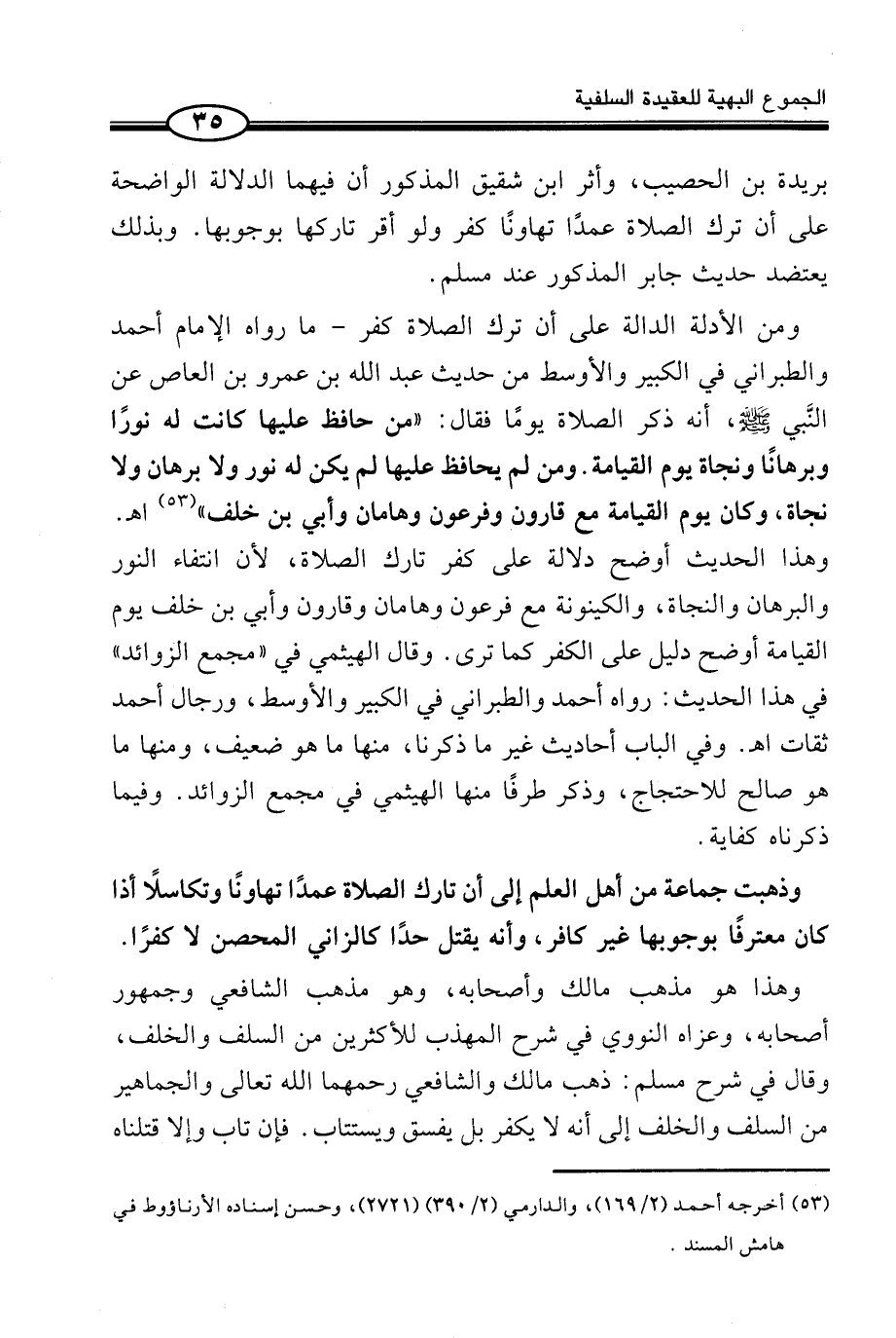 بُرَيْدَة بن الْحصيب، وَأثر ابْن شَقِيق الْمَذْكُور أَن فِيهِمَا الدَّلَالَةُ الْوَاضِحَةُ عَلَى أَنَّ تَرْكَ الصَّلَاةِ عَمْدًا تَهَاوُنًا كُفْرٌ وَلَوْ أَقَرَّ تَارِكُهَا بِوُجُوبِهَا. وَبِذَلِكَ يَعْتَضِدُ حَدِيثُ جَابِرٍ الْمَذْكُورُ عِنْدَ مُسْلِمٍ.