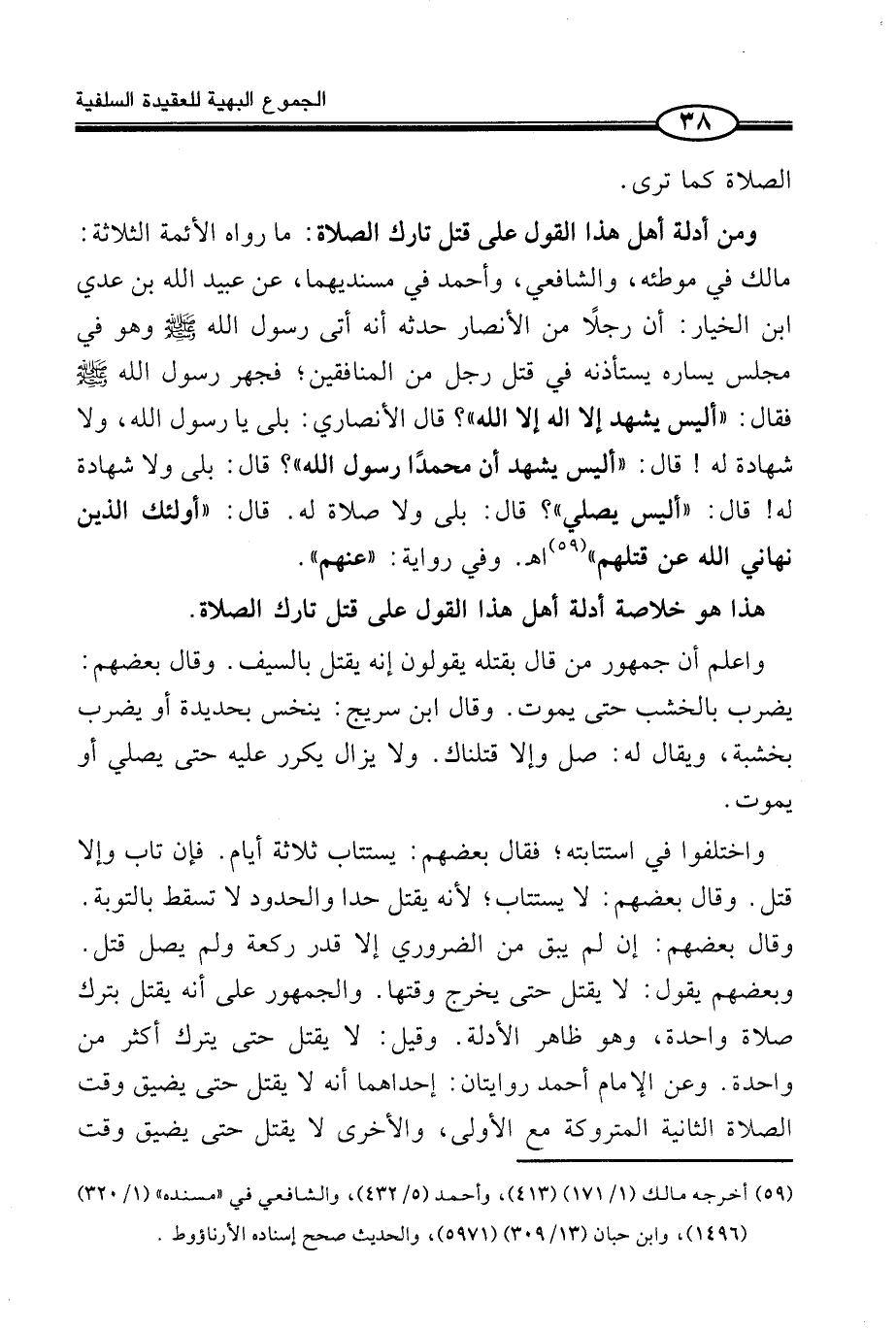 وَمِنْ أَدِلَّةِ أَهْلِ هَذَا الْقَوْلِ عَلَى قَتْلِ تَارِكِ الصَّلَاةِ: مَا رَوَاهُ الْأَئِمَّةُ الثَّلَاثَةُ: مَالِكٌ فِي مُوَطَّئِهِ، وَالشَّافِعِيُّ، وَأَحْمَدُ فِي مُسْنَدَيْهِمَا، عَنْ عُبَيْدِ اللَّهِ بْنِ عَدِيِّ بْنِ الْخِيَارِ: أَنَّ رَجُلًا مِنَ الْأَنْصَارِ حَدَّثَهُ أَنَّهُ أُتِيَ رَسُولُ اللَّهِ صَلَّى اللَّهُ عَلَيْهِ وَسَلَّمَ وَهُوَ فِي مَجْلِسٍ يُسَارُّهُ يَسْتَأْذِنُهُ فِي قَتْلِ رَجُلٍ مِنَ الْمُنَافِقِينَ؛ فَجَهَرَ رَسُولُ اللَّهِ صَلَّى اللَّهُ عَلَيْهِ وَسَلَّمَ فَقَالَ: «أَلَيْسَ يَشْهَدُ أَلَّا إِلَهَ إِلَّا اللَّهُ» ؟ قَالَ الْأَنْصَارِيُّ: بَلَى يَا رَسُولَ اللَّهِ، وَلَا شَهَادَةَ لَهُ! قَالَ: «أَلَيْسَ يَشْهَدُ أَنَّ مُحَمَّدًا رَسُولُ اللَّهِ» ؟ قَالَ: بَلَى وَلَا شَهَادَةَ لَهُ! قَالَ: «أَلَيْسَ يُصَلِّي» ؟ قَالَ: بَلَى وَلَا صَلَاةَ لَهُ. قَالَ: «أُولَئِكَ الَّذِينَ نَهَانِي اللَّهُ عَنْ قَتْلِهِمْ» (¬1) اهـ. وَفِي رِوَايَةٍ: عَنْهُمْ.