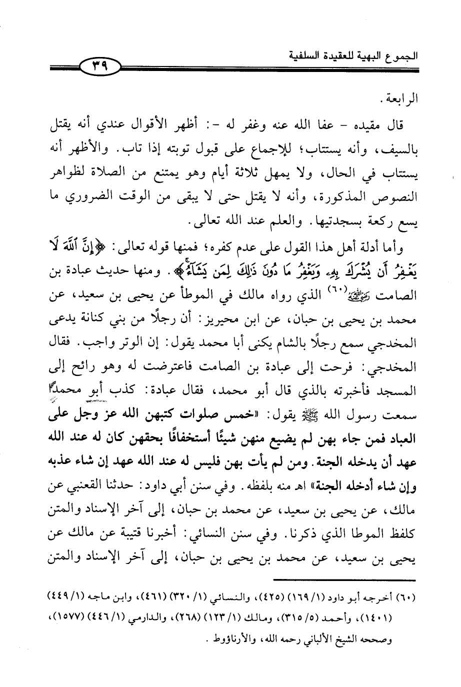 وَأَمَّا أَدِلَّةُ أَهْلِ هَذَا الْقَوْلِ عَلَى عَدَمِ كُفْرِهِ؛ فَمِنْهَا قَوْلُهُ تَعَالَى: (إِنَّ اللَّهَ لاَ يَغْفِرُ أَن يُشْرَكَ بِهِ وَيَغْفِرُ مَا دُونَ ذَلِكَ لِمَن يَشَآءُ) . وَمِنْهَا حَدِيثِ عُبَادَةَ بْنِ الصَّامِتِ رَضِيَ اللَّهُ عَنْهُ (¬1) الَّذِي رَوَاهُ مَالِكٌ فِي الْمُوَطَّأِ عَنْ يَحْيَى بْنِ سَعِيدٍ، عَنْ مُحَمَّدِ بْنِ يَحْيَى بْنِ حِبَّانَ، عَنِ ابْنِ مُحَيْرِيزٍ: أَنَّ رَجُلًا مِنْ بَنِي كِنَانَةَ يُدْعَى الْمُخَدَّجِيَّ سَمِعَ رَجُلًا بِالشَّامِ يُكَنَّى أَبَا مُحَمَّدٍ يَقُولُ: إِنَّ الْوِتْرَ وَاجِبٌ. فَقَالَ الْمُخَدَّجِيُّ: فَرُحْتُ إِلَى عُبَادَةَ بْنِ الصَّامِتِ فَاعْتَرَضْتُ لَهُ وَهُوَ رَائِحٌ إِلَى الْمَسْجِدِ فَأَخْبَرْتُهُ بِالَّذِي قَالَ أَبُو مُحَمَّدٍ، فَقَالَ عبَادَة: كذب أَبُو مُحَمَّدًا سَمِعْتُ رَسُولَ اللَّهِ صَلَّى اللَّهُ عَلَيْهِ وَسَلَّمَ يَقُولُ: «خَمْسُ صَلَوَاتٍ كَتَبَهُنَّ اللَّهُ عَزَّ وَجَلَّ عَلَى الْعِبَادِ فَمَنْ جَاءَ بِهِنَّ لَمْ يُضَيِّعْ مِنْهُنَّ شَيْئًا اسْتِخْفَافًا بِحَقِّهِنَّ كَانَ لَهُ عِنْدَ اللَّهِ عَهْدٌ أَنْ يُدْخِلَهُ الْجَنَّةَ. وَمَنْ لَمْ يَأْتِ بِهِنَّ فَلَيْسَ لَهُ عِنْدَ اللَّهِ عَهْدٌ إِنْ شَاءَ عَذَّبَهُ وَإِنْ شَاءَ أَدْخَلَهُ الْجَنَّةَ» اهـ مِنْهُ بِلَفْظِهِ. وَفِي سُنَنِ أَبِي دَاوُدَ: حَدَّثَنَا الْقَعْنَبِيُّ عَنْ مَالِكٍ، عَنْ يَحْيَى بْنِ سَعِيدٍ، عَنْ مُحَمَّدِ بْنِ حِبَّانَ، إِلَى آخِرِ الْإِسْنَادِ وَالْمَتْنُ كَلَفْظِ الْمُوَطَّأِ الَّذِي ذَكَرْنَا. وَفِي سُنَنِ النَّسَائِيِّ: أَخْبَرَنَا قُتَيْبَةُ عَنْ مَالِكٍ عَنْ يَحْيَى بْنِ سَعِيدٍ، عَنْ مُحَمَّدِ بْنِ يَحْيَى بْنِ حبَان، إِلَى آخر الْإِسْنَاد والمتن