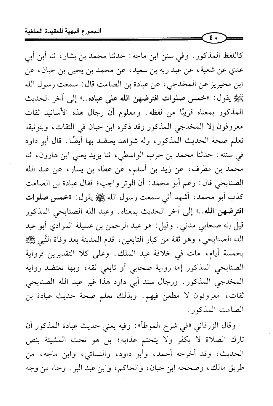 وَمَعْلُومٌ أَنَّ رِجَالَ هَذِهِ الْأَسَانِيدِ ثِقَاتٌ مَعْرُوفُونَ إِلَّا الْمُخَدَّجِيَّ الْمَذْكُورَ وَقَدْ ذَكَرَهُ ابْنُ حِبَّانَ فِي الثِّقَاتِ، وَبِتَوْثِيقِهِ تَعْلَمُ صِحَّةَ الْحَدِيثِ الْمَذْكُورِ، وَلَهُ شَوَاهِدُ يَعْتَضِدُ بِهَا أَيْضًا. قَالَ أَبُو دَاوُدَ فِي سُنَنِهِ: حَدَّثَنَا مُحَمَّدُ بْنُ حَرْبٍ الْوَاسِطِيُّ، ثَنَا يَزِيدُ يَعْنِي ابْنَ هَارُونَ، ثَنَا مُحَمَّدُ بْنُ مُطَرِّفٍ، عَنْ زَيْدِ بْنِ أَسْلَمَ، عَنْ عَطَاءِ بْنِ يَسَارٍ، عَنْ عَبْدِ اللَّهِ الصُّنَابِحِيِّ قَالَ: زَعَمَ أَبُو مُحَمَّدٍ: أَنَّ الْوِتْرَ وَاجِبٌ؛ فَقَالَ عُبَادَةُ بْنُ الصَّامِتِ كَذَبَ أَبُو مُحَمَّدٍ، أَشْهَدُ إِنِّي سَمِعْتُ رَسُولَ اللَّهِ صَلَّى اللَّهُ عَلَيْهِ وَسَلَّمَ يَقُول: «خَمْسُ صَلَوَاتٍ افْتَرَضَهُنَّ اللَّهُ..» إِلَى آخِرِ الْحَدِيثِ بِمَعْنَاهُ. وَعَبْدُ اللَّهِ الصُّنَابِحِيُّ الْمَذْكُورُ قِيلَ إِنَّهُ صَحَابِيٌّ مَدَنِيٌّ. وَقِيلَ: هُوَ عَبْدُ الرَّحْمَنِ بْنِ عُسَيْلَةَ الْمُرَادِيُّ أَبُو عَبْدِ اللَّهِ الصُّنَابِحِيُّ، وَهُوَ ثِقَةٌ مِنْ كِبَارِ التَّابِعِينَ، قَدِمَ الْمَدِينَةَ بَعْدَ وَفَاةِ النَّبي صَلَّى اللَّهُ عَلَيْهِ وَسَلَّمَ بِخَمْسَةِ أَيَّامٍ، مَاتَ فِي خِلَافَةِ عَبْدِ الْمَلِكِ. وَعَلَى كِلَا التَّقْدِيرَيْنِ فَرِوَايَةُ الصُّنَابِحِيِّ الْمَذْكُورِ إِمَّا رِوَايَةُ صَحَابِيٍّ أَوْ تَابِعِيٍّ ثِقَةٍ، وَبِهَا تَعْتَضِدُ رِوَايَةُ الْمُخَدَّجِيِّ الْمَذْكُورِ. وَرِجَالُ سَنَدِ أَبِي دَاوُدَ هَذَا غَيْرُ عَبْدِ اللَّهِ الصُّنَابِحِيِّ ثِقَاتٌ، مَعْرُوفُونَ لَا مَطْعَنَ فِيهِمْ. وَبِذَلِكَ تَعْلَمُ صِحَّةَ حَدِيثِ عُبَادَةَ بْنِ الصَّامِتِ الْمَذْكُورِ.