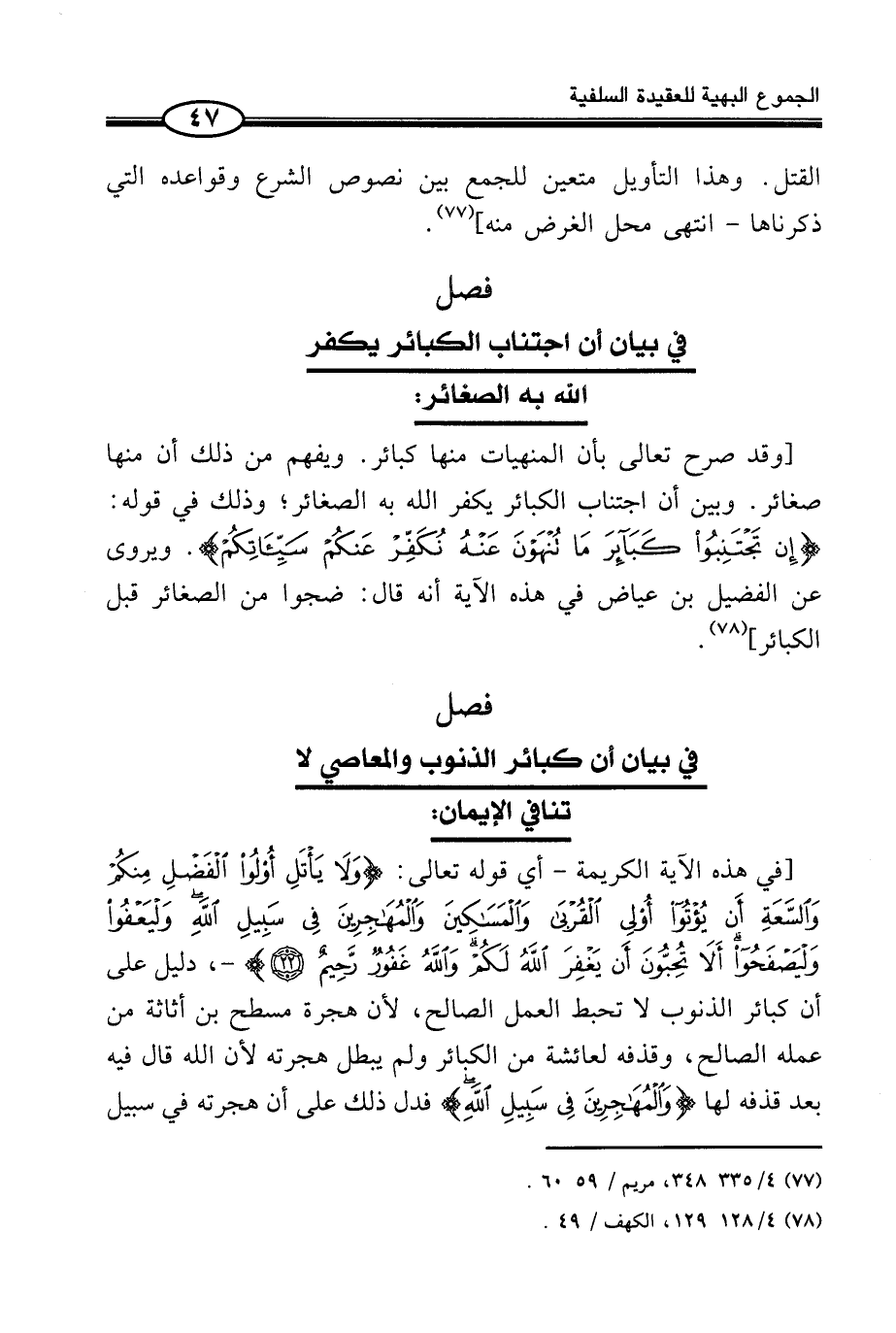[فِي هَذِه الْآيَة الْكَرِيمَة - أَي قَوْله تَعَالَى: (وَلا يَأْتَلِ أُولُو الْفَضْلِ مِنْكُمْ وَالسَّعَةِ أَنْ يُؤْتُوا أُولِي الْقُرْبَى وَالْمَسَاكِينَ وَالْمُهَاجِرِينَ فِي سَبِيلِ اللَّهِ وَلْيَعْفُوا وَلْيَصْفَحُوا أَلا تُحِبُّونَ أَنْ يَغْفِرَ اللَّهُ لَكُمْ وَاللَّهُ غَفُورٌ رَحِيمٌ) -، دَلِيلٌ عَلَى أَنَّ كَبَائِرَ الذُّنُوبِ لَا تُحْبِطُ الْعَمَلَ الصَّالِحَ، لِأَنَّ هِجْرَةَ مِسْطَحِ بْنِ أُثَاثَةَ مِنْ عَمَلِهِ الصَّالِحِ، وَقَذْفَهُ لِعَائِشَةَ مِنَ الْكَبَائِرِ وَلَمْ يُبْطِلْ هِجْرَتَهُ لِأَنَّ اللَّهَ قَالَ فِيهِ بَعْدَ قَذْفِهِ لَهَا (وَالْمُهَاجِرِينَ فِى سَبِيلِ اللَّهِ) فَدَلَّ ذَلِكَ عَلَى أَنَّ هِجْرَتَهُ فِي سَبِيلِ