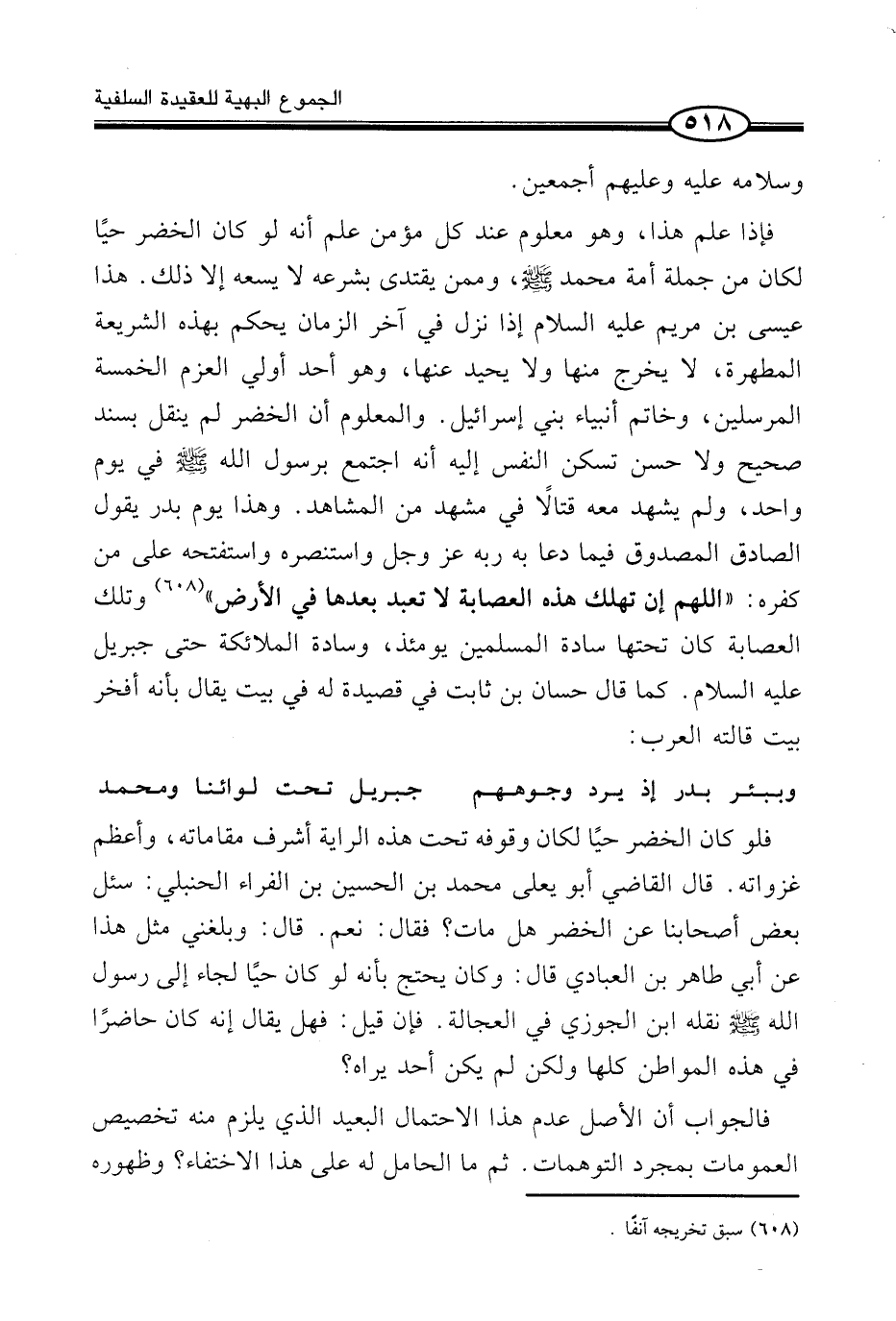 فَإِذَا عُلِمَ هَذَا، وَهُوَ مَعْلُومٌ عِنْدَ كُلِّ مُؤْمِنٍ عُلِمَ أَنَّهُ لَوْ كَانَ الْخَضِرُ حَيًّا لَكَانَ مِنْ جُمْلَةِ أُمَّةِ مُحَمَّدٍ صَلَّى اللَّهُ عَلَيْهِ وَسَلَّمَ، وَمِمَّنْ يَقْتَدِي بِشَرْعِهِ لَا يَسَعُهُ إِلَّا ذَلِكَ. هَذَا عِيسَى بْنُ مَرْيَمَ عَلَيْهِ السَّلَامُ إِذَا نَزَلَ فِي آخِرِ الزَّمَانِ يَحْكُمُ بِهَذِهِ الشَّرِيعَةِ الْمُطَهَّرَةِ، لَا يَخْرُجُ مِنْهَا وَلَا يَحِيدُ عَنْهَا، وَهُوَ أَحَدُ أُولِي الْعَزْمِ الْخَمْسَةِ الْمُرْسَلِينَ، وَخَاتَمُ أَنْبِيَاءِ بَنِي إِسْرَائِيلَ. وَالْمَعْلُومُ أَنَّ الْخَضِرَ لَمْ يَنْقُلْ بِسَنَدٍ صَحِيحٍ وَلَا حَسَنٍ تَسْكُنُ النَّفْسُ إِلَيْهِ أَنَّهُ اجْتَمَعَ بِرَسُولِ اللَّهِ صَلَّى اللَّهُ عَلَيْهِ وَسَلَّمَ فِي يَوْمٍ وَاحِدٍ، وَلَمْ يَشْهَدْ مَعَهُ قِتَالًا فِي مَشْهَدٍ مِنَ الْمَشَاهِدِ. وَهَذَا يَوْمُ بَدْرٍ يَقُولُ الصَّادِقُ الْمَصْدُوقُ فِيمَا دَعَا بِهِ رَبَّهُ عَزَّ وَجَلَّ وَاسْتَنْصَرَهُ وَاسْتَفْتَحَهُ عَلَى مَنْ كَفَرَهُ: «اللَّهُمَّ إِنَّ تُهْلِكْ هَذِهِ الْعِصَابَةَ لَا تُعْبَدُ بَعْدَهَا فِي الْأَرْضِ» (¬1) وَتِلْكَ الْعِصَابَةُ كَانَ تَحْتَهَا سَادَةُ الْمُسْلِمِينَ يَوْمَئِذٍ، وَسَادَةُ الْمَلَائِكَةِ حَتَّى جِبْرِيلَ عَلَيْهِ السَّلَامُ. كَمَا قَالَ حَسَّانُ بْنُ ثَابِتٍ فِي قَصِيدَةٍ لَهُ فِي بَيْتٍ يُقَالُ بِأَنَّهُ أَفْخَرُ بَيْتٍ قَالَتْهُ الْعَرَبُ: