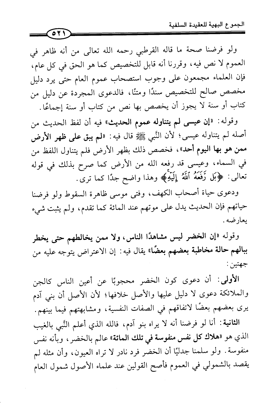 وَقَوْلُهُ «إِنَّ الْخَضِرَ لَيْسَ مشاهداً النَّاس، وَلَا مِمَّنْ يُخَالِطُهُمْ حَتَّى يَخْطُرَ بِبَالِهِمْ حَالَةَ مُخَاطَبَةِ بَعْضِهِمْ بَعْضًا» يُقَالُ فِيهِ: إِنَّ الِاعْتِرَاضَ يَتَوَجَّهُ عَلَيْهِ مِنْ جِهَتَيْنِ: