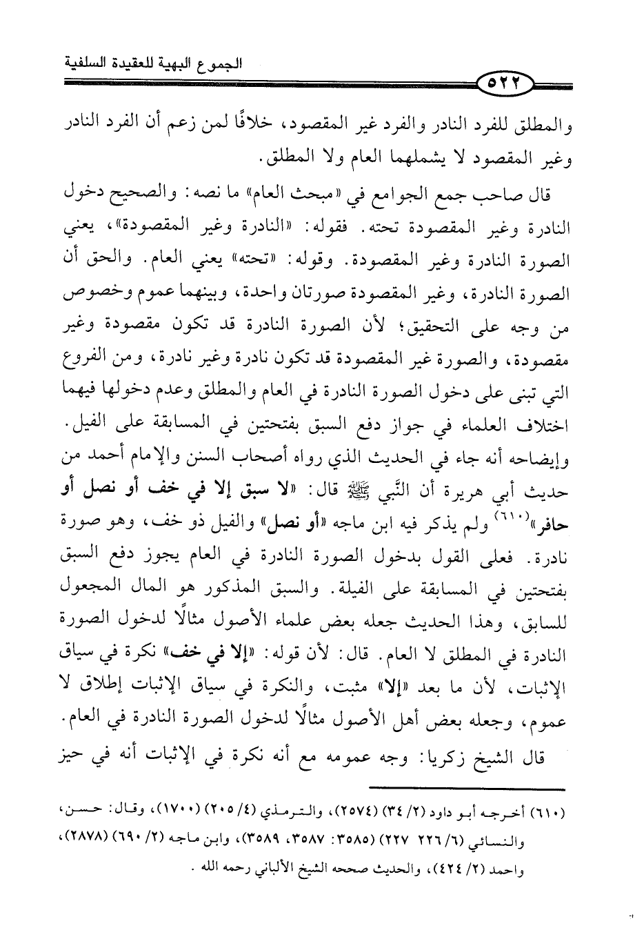 قَالَ صَاحِبُ جَمْعِ الْجَوَامِعِ فِي «مَبْحَثِ الْعَامِّ» مَا نَصُّهُ: وَالصَّحِيحُ دُخُولُ النَّادِرَةِ وَغَيْرِ الْمَقْصُودَةِ تَحْتَهُ. فَقَوْلُهُ: «النَّادِرَةُ وَغَيْرُ الْمَقْصُودَةِ» ، يَعْنِي الصُّورَةَ النَّادِرَةَ وَغَيْرَ الْمَقْصُودَةِ. وَقَوْلُهُ: «تَحْتَهُ» يَعْنِي الْعَامَّ. وَالْحَقُّ أَنَّ الصُّورَةَ النَّادِرَةَ، وَغَيْرَ الْمَقْصُودَةِ صُورَتَانِ وَاحِدَةٌ، وَبَيْنَهُمَا عُمُومٌ وَخُصُوصٌ مِنْ وَجْهٍ عَلَى التَّحْقِيقِ؛ لِأَنَّ الصُّورَةَ النَّادِرَةَ قَدْ تَكُونُ مَقْصُودَةً وَغَيْرَ مَقْصُودَةٍ، وَالصُّورَةُ غَيْرُ الْمَقْصُودَةِ قَدْ تَكُونُ نَادِرَةً وَغَيْرَ نَادِرَةٍ، وَمِنَ الْفُرُوعِ الَّتِي تُبْنَى عَلَى دُخُولِ الصُّورَةِ النَّادِرَةِ فِي الْعَامِّ وَالْمُطْلَقِ وَعَدَمِ دُخُولِهَا فِيهِمَا اخْتِلَافُ الْعُلَمَاءِ فِي جَوَازِ دَفْعِ السَّبَقِ بِفَتْحَتَيْنِ فِي الْمُسَابَقَةِ عَلَى الْفِيلِ. وَإِيضَاحُهُ أَنَّهُ جَاءَ فِي الْحَدِيثِ الَّذِي رَوَاهُ أَصْحَابُ السُّنَنِ وَالْإِمَامُ أَحْمَدُ مِنْ حَدِيثِ أَبِي هُرَيْرَةَ أَنَّ النَّبي صَلَّى اللَّهُ عَلَيْهِ وَسَلَّمَ قَالَ: «لَا سَبَقَ إِلَّا فِي خُفٍّ أَوْ نَصْلٍ أَوْ حَافِرٍ» (¬1) وَلَمْ يَذْكُرْ فِيهِ ابْنُ مَاجَهْ «أَوْ نَصْلٍ» وَالْفِيلُ ذُو خُفٍّ، وَهُوَ صُورَةٌ نَادِرَةٌ. فَعَلَى الْقَوْلِ بِدُخُولِ الصُّورَةِ النَّادِرَةِ فِي الْعَامِّ يَجُوزُ دَفْعُ السَّبَقِ بِفَتْحَتَيْنِ فِي الْمُسَابَقَةِ عَلَى الْفِيَلَةِ. وَالسَّبَقُ الْمَذْكُورُ هُوَ الْمَالُ الْمَجْعُولُ لِلسَّابِقِ، وَهَذَا الْحَدِيثُ جَعَلَهُ بَعْضُ عُلَمَاءِ الْأُصُولِ مِثَالًا لِدُخُولِ الصُّورَةِ النَّادِرَةِ فِي الْمُطْلَقِ لَا الْعَامِّ. قَالَ: لِأَنَّ قَوْلَهُ: «إِلَّا فِي خُفٍّ» نَكِرَةٌ فِي سِيَاقِ الْإِثْبَاتِ، لِأَنَّ مَا بَعْدَ «إِلَّا» مُثْبَتٌ، وَالنَّكِرَةُ فِي سِيَاقِ الْإِثْبَاتِ إِطْلَاقٌ لَا عُمُومٌ، وَجَعَلَهُ بَعْضُ أَهْلِ الْأُصُولِ مِثَالًا لِدُخُولِ الصُّورَةِ النَّادِرَةِ فِي الْعَامِّ.