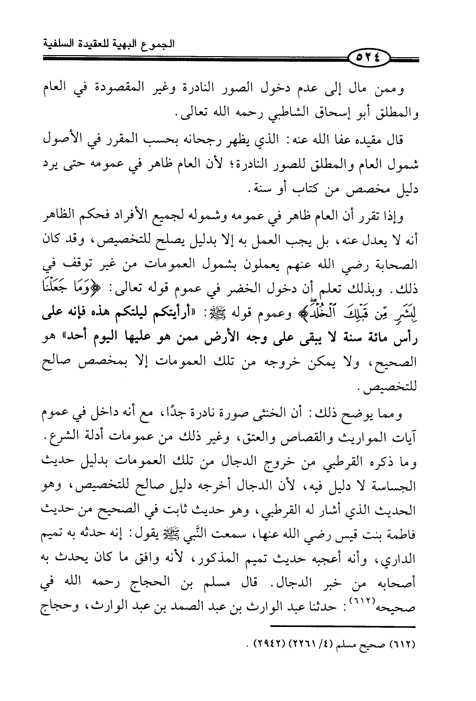 وَمِمَّا يُوَضِّحُ ذَلِكَ: أَنَّ الْخُنْثَى صُورَةٌ نَادِرَةٌ جِدًّا، مَعَ أَنَّهُ دَاخِلٌ فِي عُمُومِ آيَاتِ الْمَوَارِيثِ وَالْقِصَاصِ وَالْعِتْقِ، وَغَيْرِ ذَلِكَ مِنْ عُمُومَاتِ أَدِلَّةِ الشَّرْعِ. وَمَا ذَكَرَهُ الْقُرْطُبِيُّ مِنْ خُرُوجِ الدَّجَّالِ مِنْ تِلْكَ الْعُمُومَاتِ بِدَلِيلِ حَدِيثِ الْجَسَّاسَةِ لَا دَلِيلَ فِيهِ، لِأَنَّ الدَّجَّالَ أَخْرَجَهُ دَلِيلٌ صَالِحٌ لِلتَّخْصِيصِ، وَهُوَ الْحَدِيثُ الَّذِي أَشَارَ لَهُ الْقُرْطُبِيُّ، وَهُوَ حَدِيثٌ ثَابِتٌ فِي الصَّحِيحِ مِنْ حَدِيثِ فَاطِمَةَ بِنْتِ قَيْسٍ رَضِيَ اللَّهُ عَنْهَا، سَمِعْتُ النَّبي صَلَّى اللَّهُ عَلَيْهِ وَسَلَّمَ يَقُولُ: إِنَّهُ حَدَّثَهُ بِهِ تَمِيمٌ الدَّارِيُّ، وَأَنَّهُ أَعْجَبَهُ حَدِيثُ تَمِيمٍ الْمَذْكُورُ، لِأَنَّهُ وَافَقَ مَا كَانَ يُحَدِّثُ بِهِ أَصْحَابَهُ مِنْ خَبَرِ الدَّجَّالِ. قَالَ مُسْلِمُ بْنُ الْحَجَّاجِ رَحِمَهُ اللَّهُ فِي صَحِيحِهِ (¬1) : حَدَّثَنَا عَبْدُ الْوَارِثِ بْنُ عَبْدِ الصَّمَدِ بن عبد الْوَارِث، وحجاج