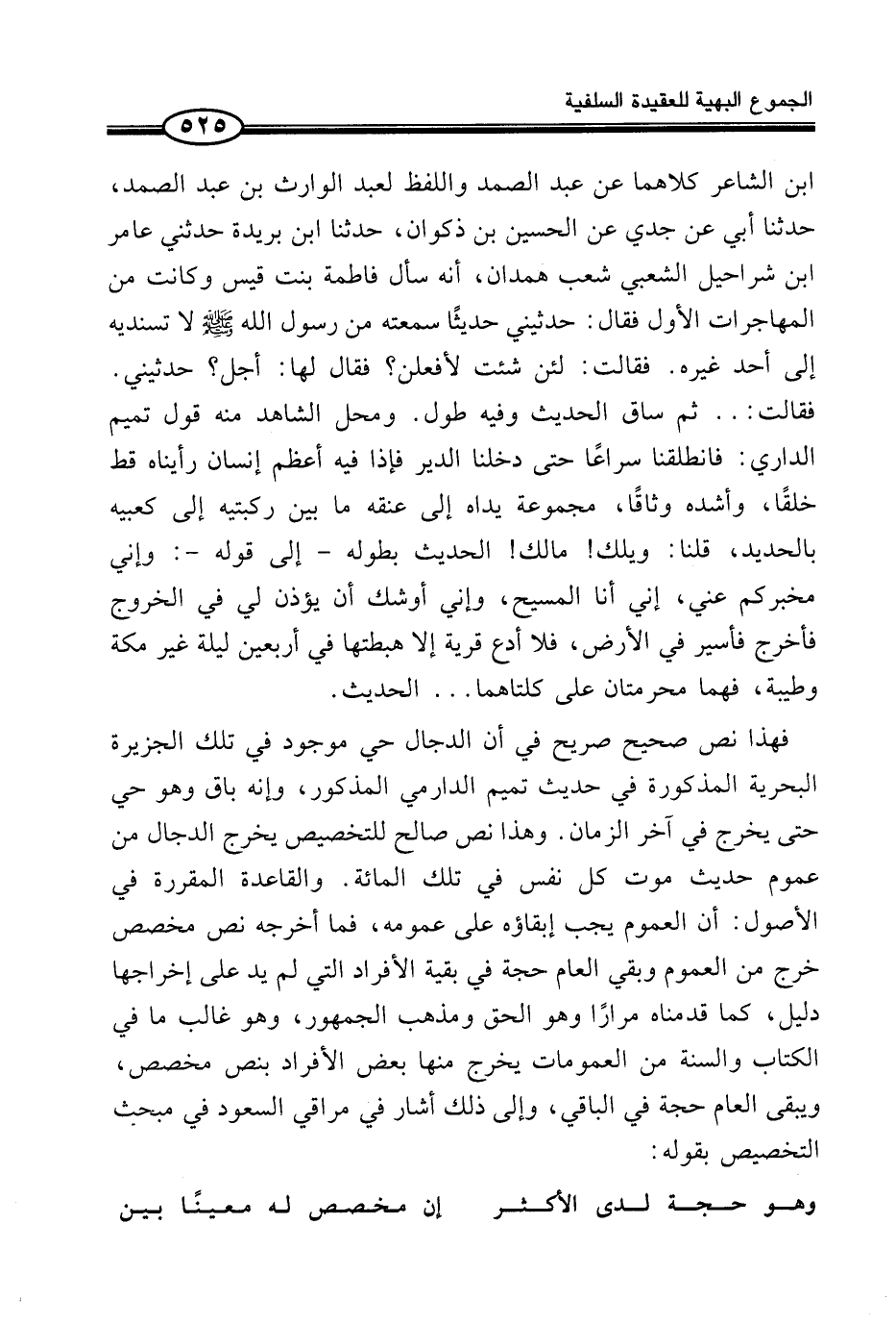 فَهَذَا نَصٌّ صَحِيحٌ صَرِيحٌ فِي أَنَّ الدَّجَّالَ حَيٌّ مَوْجُودٌ فِي تِلْكَ الْجَزِيرَةِ البحرية الْمَذْكُورَة فِي حَدِيث تَمِيم الدَّارمِيّ الْمَذْكُورِ، وَإِنَّهُ بَاقٍ وَهُوَ حَيٌّ حَتَّى يَخْرُجَ فِي آخِرِ الزَّمَانِ. وَهَذَا نَصٌّ صَالِحٌ لِلتَّخْصِيصِ يُخْرِجُ الدَّجَّالَ مِنْ عُمُومِ حَدِيثِ مَوْتِ كُلِّ نَفْسٍ فِي تِلْكَ الْمِائَةِ. وَالْقَاعِدَةُ الْمُقَرَّرَةُ فِي الْأُصُولِ: أَنَّ الْعُمُومَ يَجِبُ إِبْقَاؤُهُ عَلَى عُمُومِهِ، فَمَا أَخْرَجَهُ نَصٌّ مُخَصِّصٌ خَرَجَ مِنَ الْعُمُومِ وَبَقِيَ الْعَامُّ حُجَّةً فِي بَقِيَّةِ الْأَفْرَادِ الَّتِي لم يَد عَلَى إِخْرَاجِهَا دَلِيلٌ، كَمَا قَدَّمْنَاهُ مِرَارًا وَهُوَ الْحَقُّ وَمَذْهَبُ الْجُمْهُورِ، وَهُوَ غَالِبُ مَا فِي الْكِتَابِ وَالسُّنَّةِ مِنَ الْعُمُومَاتِ يَخْرُجُ مِنْهَا بَعْضُ الْأَفْرَادِ بِنَصٍّ مُخَصِّصٍ، وَيَبْقَى الْعَامُّ حُجَّةً فِي الْبَاقِي، وَإِلَى ذَلِكَ أَشَارَ فِي مَرَاقِي السُّعُودِ فِي مَبْحَثِ التَّخْصِيصِ بِقَوْلِهِ: