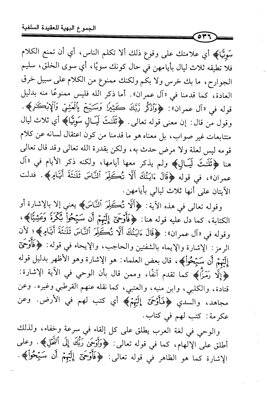 وَقَوْلُهُ تَعَالَى فِي هَذِهِ الْآيَةِ: {أَلاَّ تُكَلِّمَ النَّاسَ} يَعْنِي إِلَّا بِالْإِشَارَةِ أَوِ الْكِتَابَةِ، كَمَا دَلَّ عَلَيْهِ قَوْلُهُ هُنَا: {فَأَوْحَى إِلَيْهِمْ أَن سَبِّحُواْ بُكْرَةً وَعَشِيّاً} ، وَقَوْلُهُ فِي «آلِ عِمْرَانَ» : {قَالَ آيَتُكَ أَلاَّ تُكَلِّمَ النَّاسَ ثَلَاثَةَ أَيَّامٍ} ؛ لِأَنَّ الرَّمْزَ: الْإِشَارَةُ وَالْإِيمَاءُ بِالشَّفَتَيْنِ وَالْحَاجِبِ، وَالْإِيحَاءُ فِي قَوْله: {فَأَوْحَى إِلَيْهِمْ أَن سَبِّحُواْ} ، قَالَ بَعْضُ الْعُلَمَاءِ: هُوَ الْإِشَارَةُ وَهُوَ الْأَظْهَرُ بِدَلِيلِ قَوْلِهِ «إِلَّا رَمْزًا» كَمَا تَقَدَّمَ آنِفًا، وَمِمَّنْ قَالَ بِأَنَّ الْوَحْيَ فِي الْآيَةِ الْإِشَارَةُ: قَتَادَةُ، وَالْكَلْبِيُّ، وَابْنُ مُنَبِّهٍ، وَالْعُتْبِيُّ، كَمَا نَقَلَهُ عَنْهُمُ الْقُرْطُبِيُّ وَغَيْرُهُ. وَعَنْ مُجَاهِدٍ، وَالسُّدِّيِّ «فَأَوْحَى إِلَيْهِمْ» أَيْ كَتَبَ لَهُمْ فِي الْأَرْضِ. وَعَنْ عِكْرِمَةَ: كَتَبَ لَهُمْ فِي كِتَابٍ.