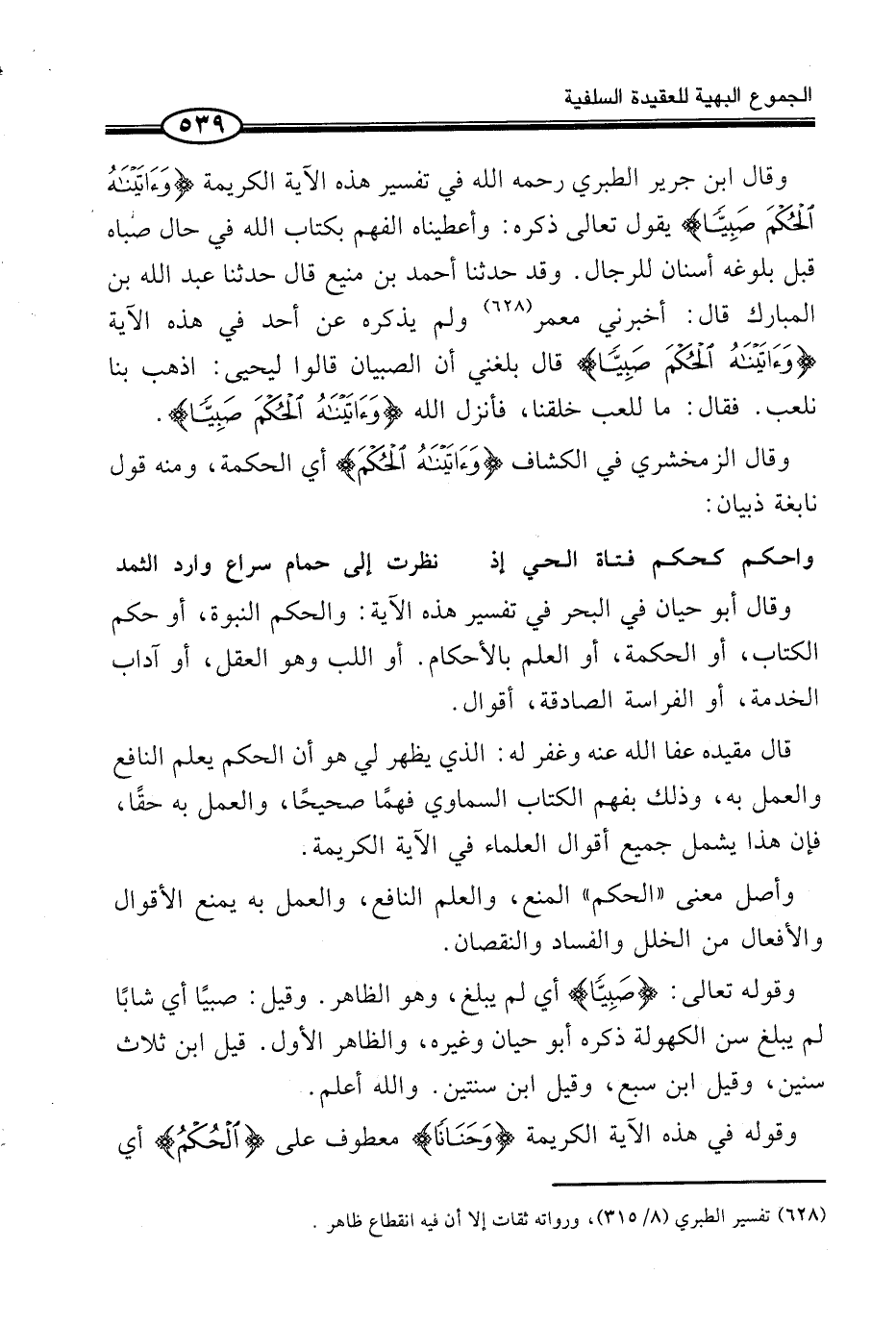 وَقَالَ ابْنُ جَرِيرٍ الطَّبَرِيُّ رَحِمَهُ اللَّهُ فِي تَفْسِيرِ هَذِهِ الْآيَةِ الْكَرِيمَةِ {وَآتَيْنَاهُ الْحُكْمَ صَبِيّاً} يَقُولُ تَعَالَى ذِكْرُهُ: وَأَعْطَيْنَاهُ الْفَهْمَ بِكِتَابِ اللَّهِ فِي حَال صباه قبل بُلُوغه أَسْنَان للرِّجَال. وَقَدْ حَدَّثَنَا أَحْمَدُ بْنُ مَنِيعٍ قَالَ حَدَّثَنَا عَبْدُ اللَّهِ بْنُ الْمُبَارَكِ قَالَ: أَخْبَرَنِي مَعْمَرٌ (¬1) وَلَمْ يَذْكُرْهُ عَنْ أَحَدٍ فِي هَذِهِ الْآيَةِ «وَآتَيْنَاهُ الْحُكْمَ صَبِيًّا» قَالَ بَلَغَنِي أَنَّ الصِّبْيَانَ قَالُوا لِيَحْيَى: اذْهَبْ بِنَا نَلْعَبُ. فَقَالَ: مَا لِلَّعِبِ خُلِقْنَا، فَأَنْزَلَ اللَّهُ {وَآتَيْنَاهُ الْحُكْمَ صَبِيّاً} وَقَالَ الزَّمَخْشَرِيُّ فِي الْكَشَّافِ {وَآتَيْنَاهُ الْحُكْمَ} أَيِ الْحِكْمَةَ، وَمِنْهُ قَوْلُ نَابِغَةَ ذُبْيَانَ: